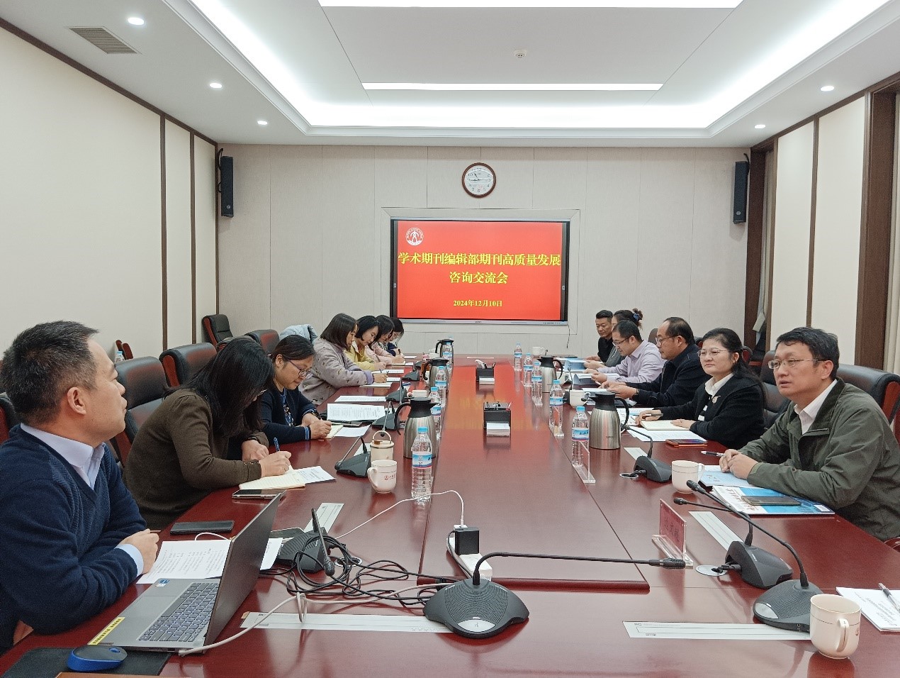 12月10日,学术期刊编辑部在明德楼302会议室举办期刊高质量发展咨询交流会,山东大学出版社、科技期刊社社长陈斌,山东中医药大学期刊社社长吴俊玲,《山东科学》《齐鲁工业大学学报》编辑部主任徐学友,《山东电力技术》编辑部主任韩英昆,山东大学科技期刊社办公室主任姜波,我校学术期刊编辑部主任、《山东交通学院学报》《内燃机与动力装置》副主编郎伟锋参加会议。
