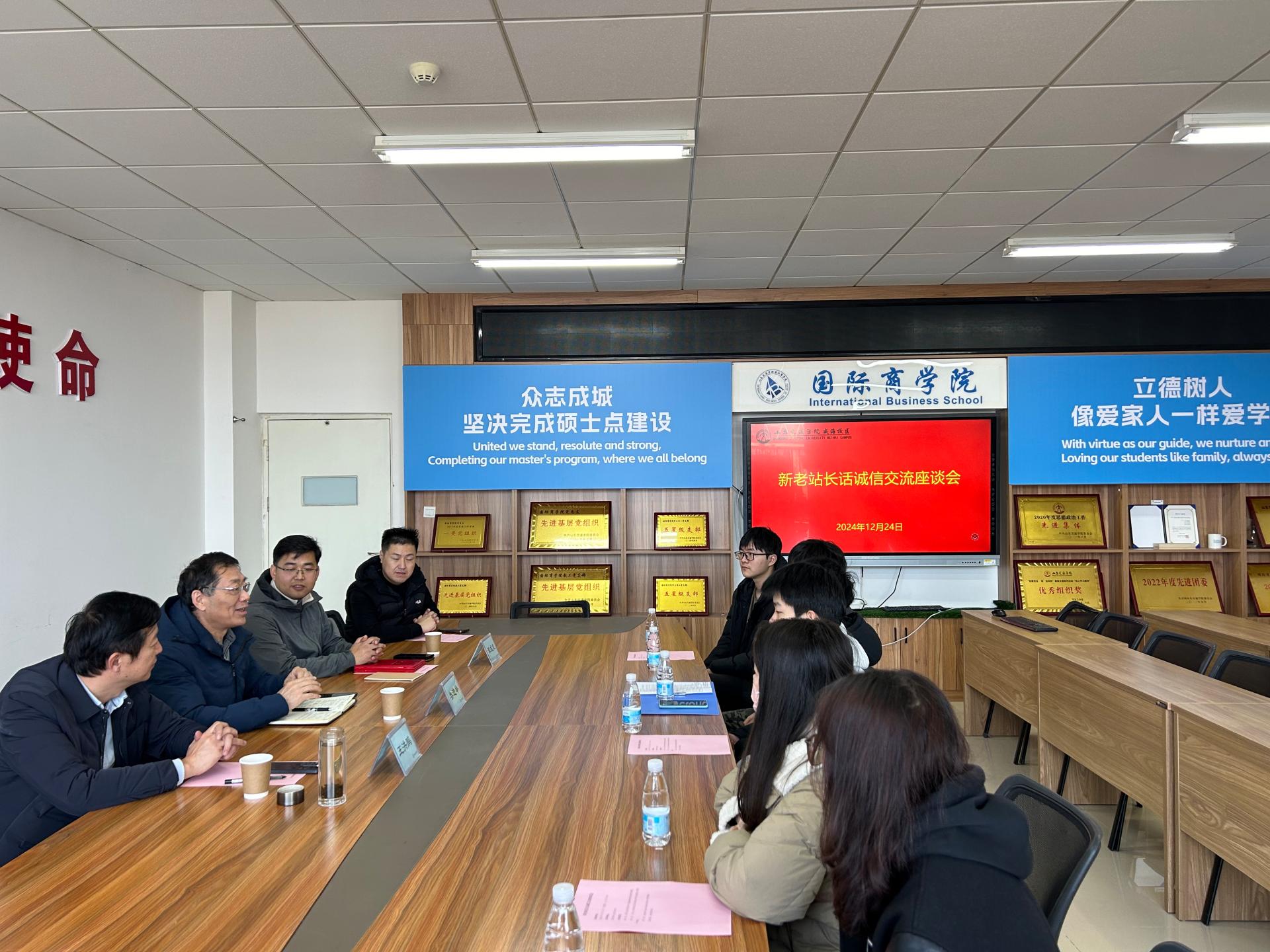 学校关工委与威海校区管理办公室学团工作部在国际商学院会议室举办“新老站长话诚信”交流座谈会。王洪鹏介绍了近年来学校关工委在开展学生关心关爱工作等方面的基本情况;学校诚信驿站第二任站长、09级校友谭成志分享了自己在诚信驿站的“进站”学习感受和毕业后“出站”进行创业的体会,并与威海校区诚信驿站成员围绕诚信驿站的运营和发展等方面深入探讨;娄进举详细介绍了诚信驿站的发展历程和诚信驿站“教育基地”“文化景点”“示范窗口”“学校名片”“地理标识”等五大功能,并为诚信驿站第一任站长、08级校友孙凤慧,第二任站长谭成志颁发诚信驿站校外指导老师聘书。