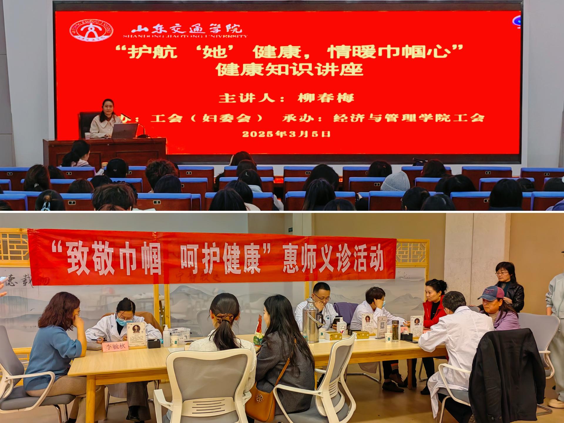 学校工会(妇委会)开展系列活动庆祝“三八”国际妇女节。在长清校区机电楼B107会议室举办“护航‘她’健康 情暖巾帼心”健康知识讲座,讲座由经济与管理学院工会(妇委会)承办。活动邀请济南市第四人民医院中医科副主任柳春梅讲授《女性养生智慧》,她以中医养生理论为基础,结合现代医学知识,通过案例分析、现场演示穴位按摩等互动方式,生动普及“治未病”理念,倡导“因时择食、因人施养”的健康生活方式;在教工之家开展“致敬巾帼 呵护健康”惠师义诊活动,邀请山东新中鲁中医医院马月香、武伟生、李毓秋等专家,为教职工仔细诊脉,针对身体情况及检查结果进行专业诊断,提供科学的疾病防治和养生保健方案,耐心细致地解答大家提出的各种问题。