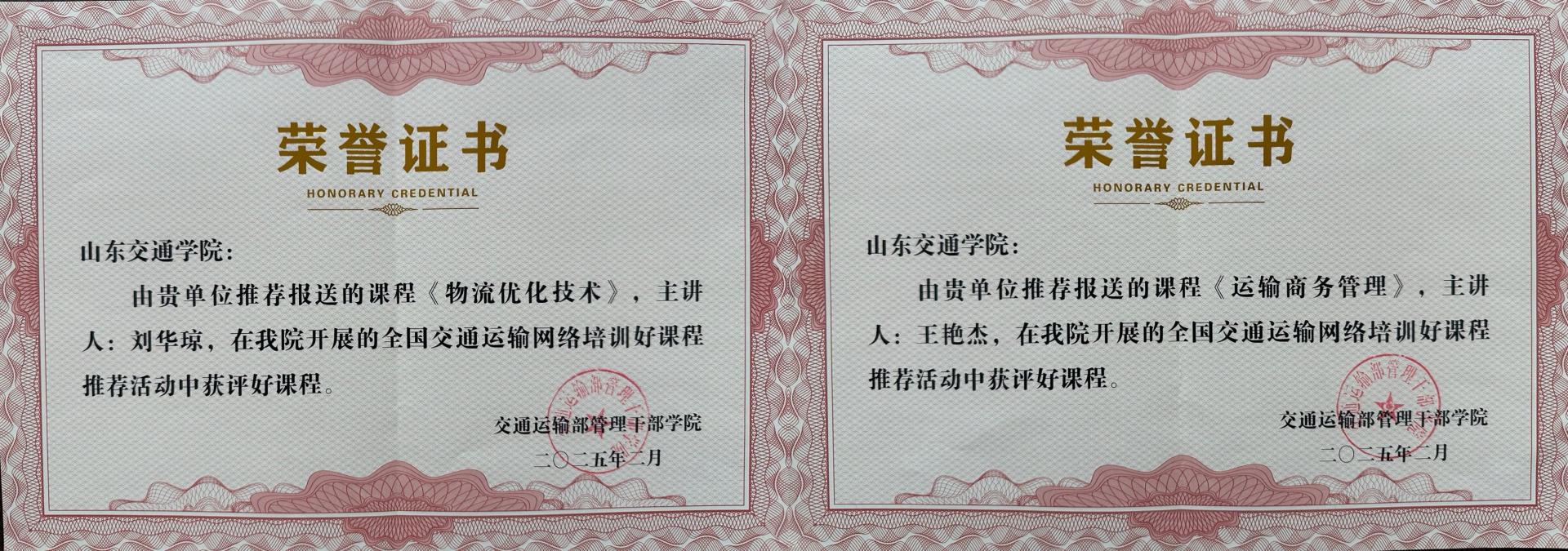 近日,由交通运输部管理干部学院开展的全国交通运输网络培训好课程推荐活动评选结果发布,经我校“山东交通教育培训中心”网络学习平台报送,交通与物流工程学院刘华琼主讲的《物流优化技术》、汽车工程学院王艳杰主讲的《运输商务管理》课程成功获评。