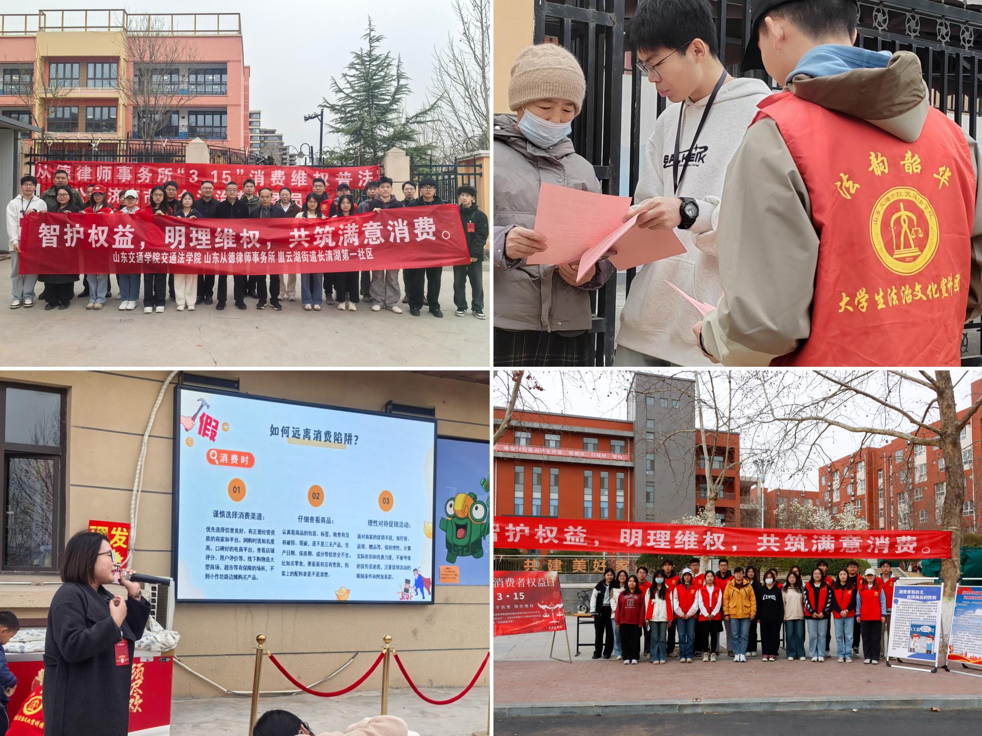 在校外,学院联合山东从德律师事务所在崮云湖街道长清湖第一社区开展普法宣传活动,通过普法宣讲、展板宣传、发放宣传资料、现场答疑解惑等方式,向社区居民宣传普及《中华人民共和国消费者权益保护法》等相关法律法规,并针对网络购物纠纷、假冒伪劣商品识别、消费欺诈防范等热点问题进行讲解,帮助居民提高安全消费意识。