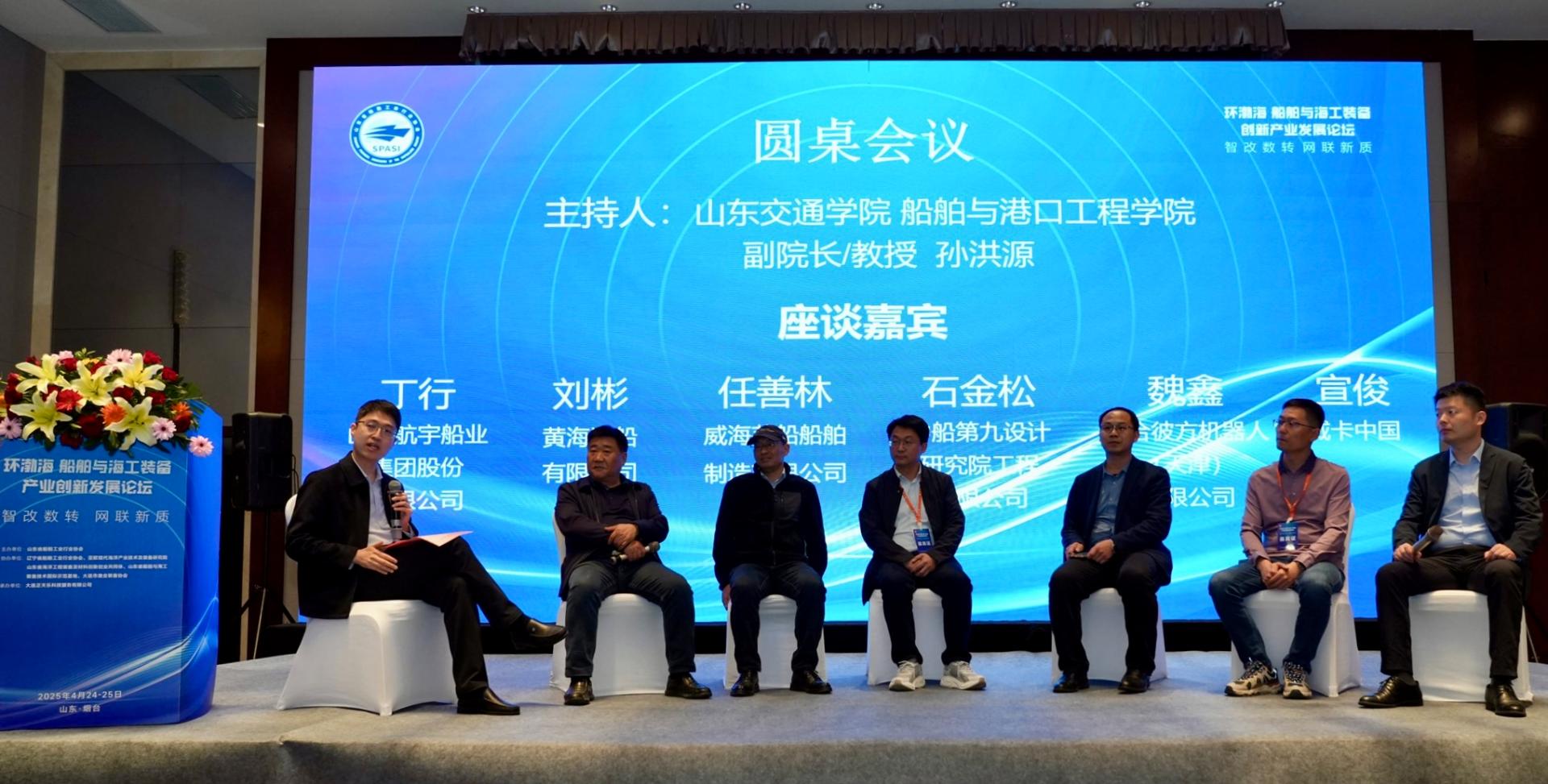 会上,孙洪源在主题圆桌会议环节担任主持,与来自山东航宇船业集团有限公司、黄海造船有限公司、威海芜船船舶制造有限公司、中船第九设计研究院、彼合彼方机器人(天津)有限公司、威卡中国船舶的六位行业专家深度对话,从技术创新、市场需求、政策支持等多个维度深入剖析当前产业发展痛点并提出可行性建议。