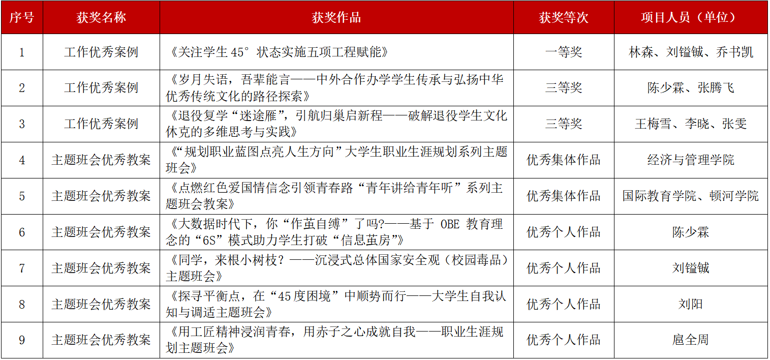 近日,中共山东省委教育工委公布2024年全省高校辅导员工作创新项目评选结果,我校荣获工作优秀案例一等奖1项、三等奖2项,辅导员主题班会优秀教案集体作品2项、个人作品4项。