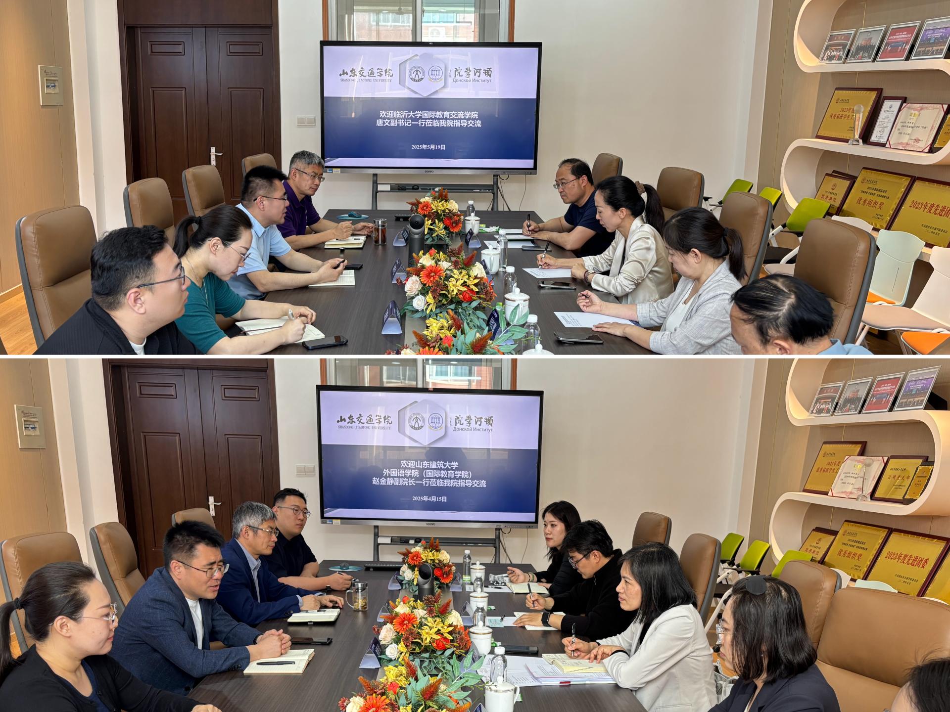 近日,山东建筑大学国际教育学院副院长赵金静一行5人,临沂大学国际教育交流学院党委副书记(主持学院党委工作)、副院长唐文一行4人分别来我校国际教育学院、顿河学院调研交流。我校国际教育学院、顿河学院院长刘春光参加活动。