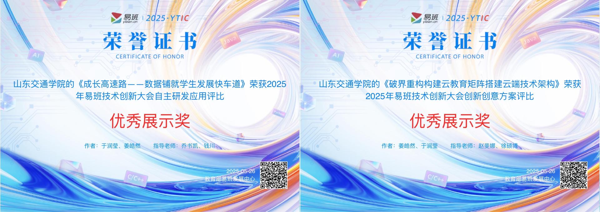 近日,由教育部易班发展中心主办的2025年全国高校易班技术创新大会在广东珠海举行。我校易班发展中心与信息科学与电气工程学院(人工智能学院)共创作品《成长高速路——数据铺就学生发展快车道》荣获自主研发应用评比“优秀展示奖”,《破界重构构建云教育矩阵搭建云端技术架构》荣获创新创意方案评比“优秀展示奖”。