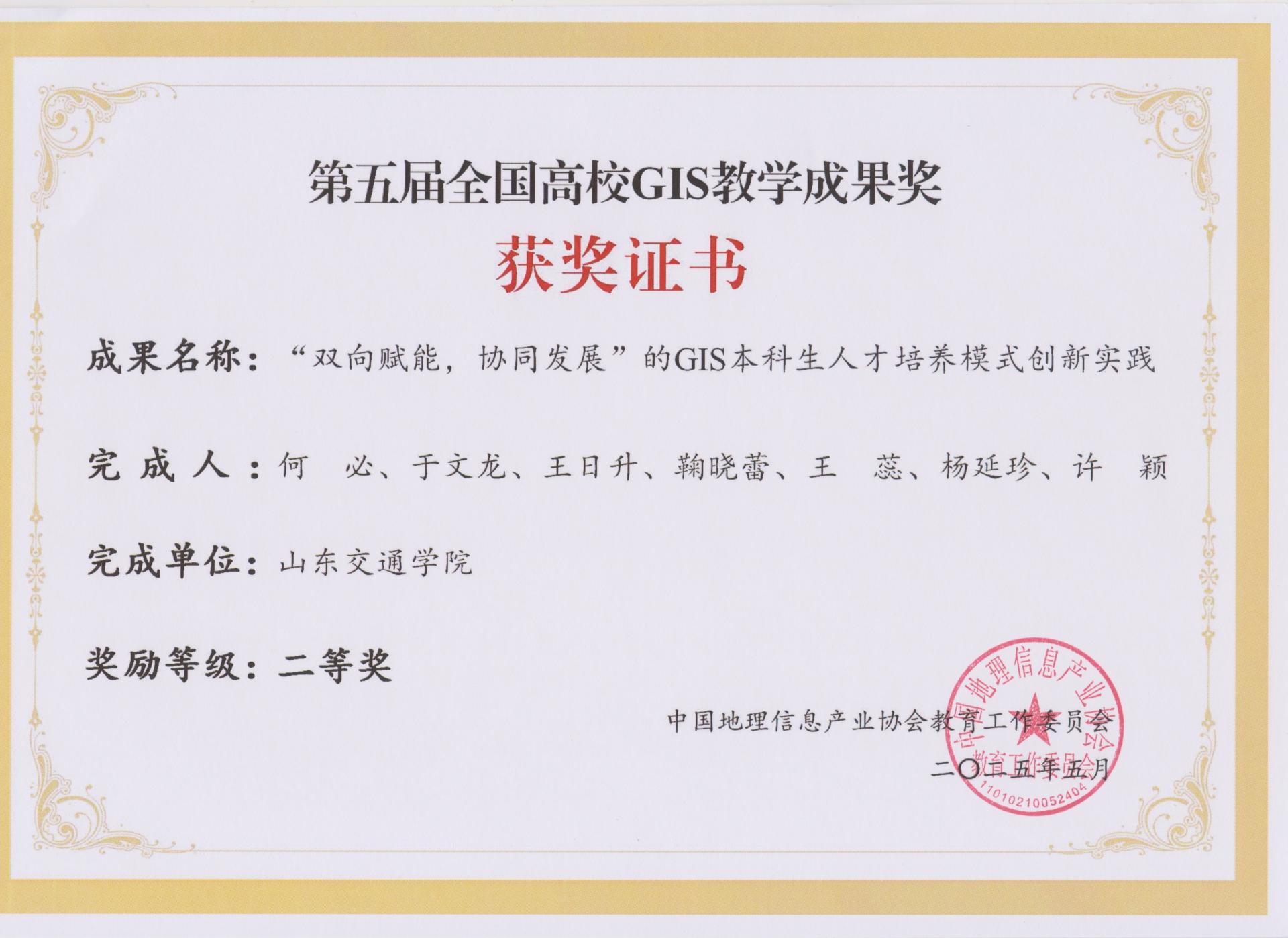 近日,第五届全国高校GIS教学成果奖评选结果公布,我校交通土建工程学院何必副教授团队《“双向赋能,协同发展”的GIS本科生人才培养模式创新实践》教学成果荣获二等奖。