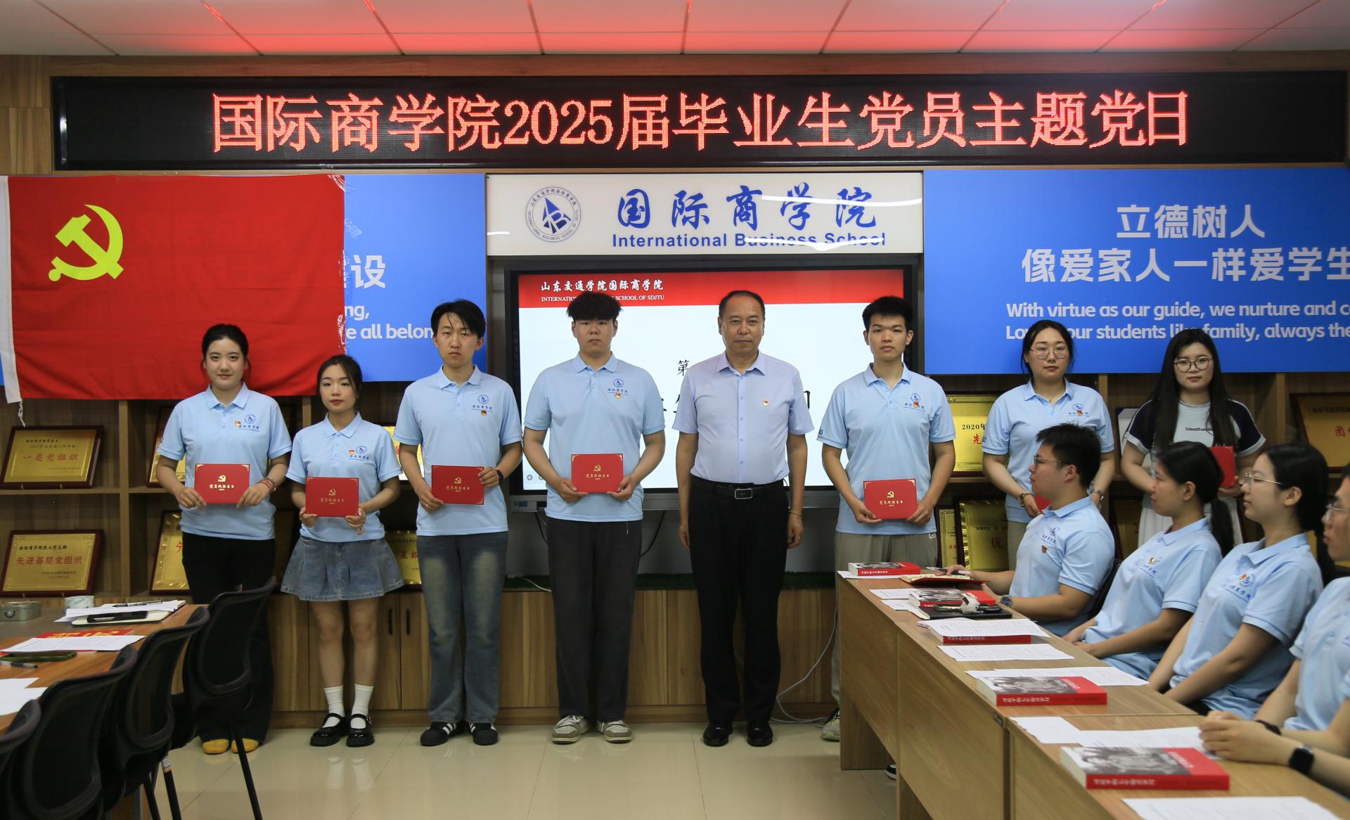 国际商学院党委组织开展毕业生党员庆“七一”主题党日活动。学院党委书记刘佳军,党委副书记、院长孙龙参加活动。活动中,刘佳军为部分党员赠送“政治生日”贺卡,并以“青春奋进交通强国路,八项规定护航廉洁行”为题讲授专题党课,他希望,全体毕业生党员要强化纪律规矩观念,发扬国商学子的优良品格,积极投身于交通强国建设,努力成为可堪大用、能担重任的栋梁之材;孙龙为获得校企合作奖学金的毕业生党员进行颁奖,并勉励同学们将荣誉转化为动力,接续奋斗、砥砺前行;学院党委副书记刘洋向毕业生党员赠送书籍。