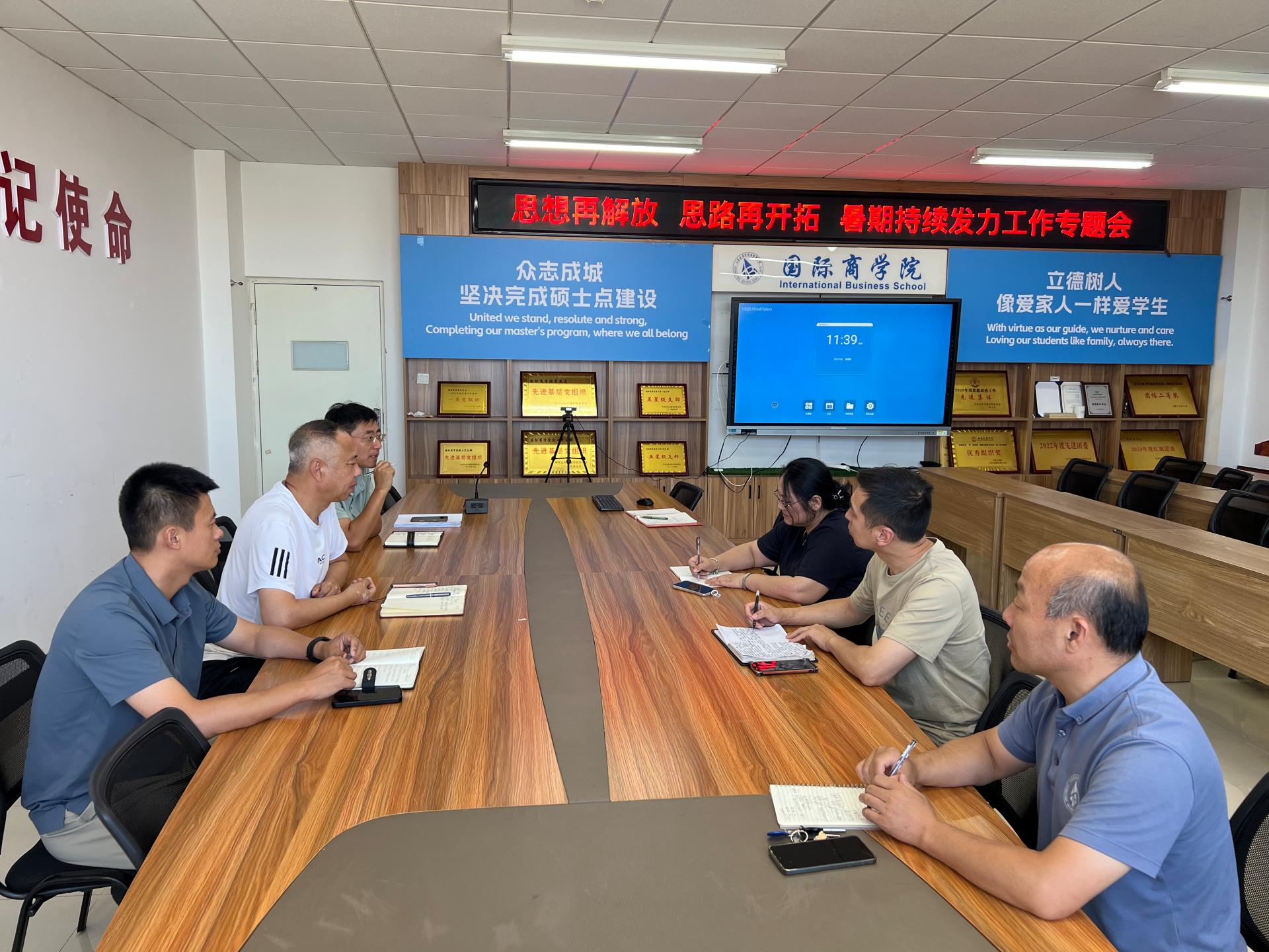 国际商学院召开“思想再解放 思路再开拓 暑期持续发力”工作专题会。学院党委书记刘佳军参加会议,党委副书记、院长孙龙主持会议。国际商学院相关负责人、各系主任参加会议。会上,刘佳军对学院全体教职工提出三点要求,一要聚焦重点、履职尽责,主动担当作为;二要解放思想、建言献策,积极参与学校解放思想大讨论;三要严守底线、安全第一,时刻绷紧安全弦。孙龙对学院暑期及下一阶段重点工作进行安排,他指出,各系要利用暑期关键时期,重点聚焦本科教育教学审核评估、国际商务专业硕士点建设、教师暑期专业调研及访企拓岗等重点任务,谋划发展、积蓄力量,确保各项工作暑期不断线,着力推动学院高质量发展。