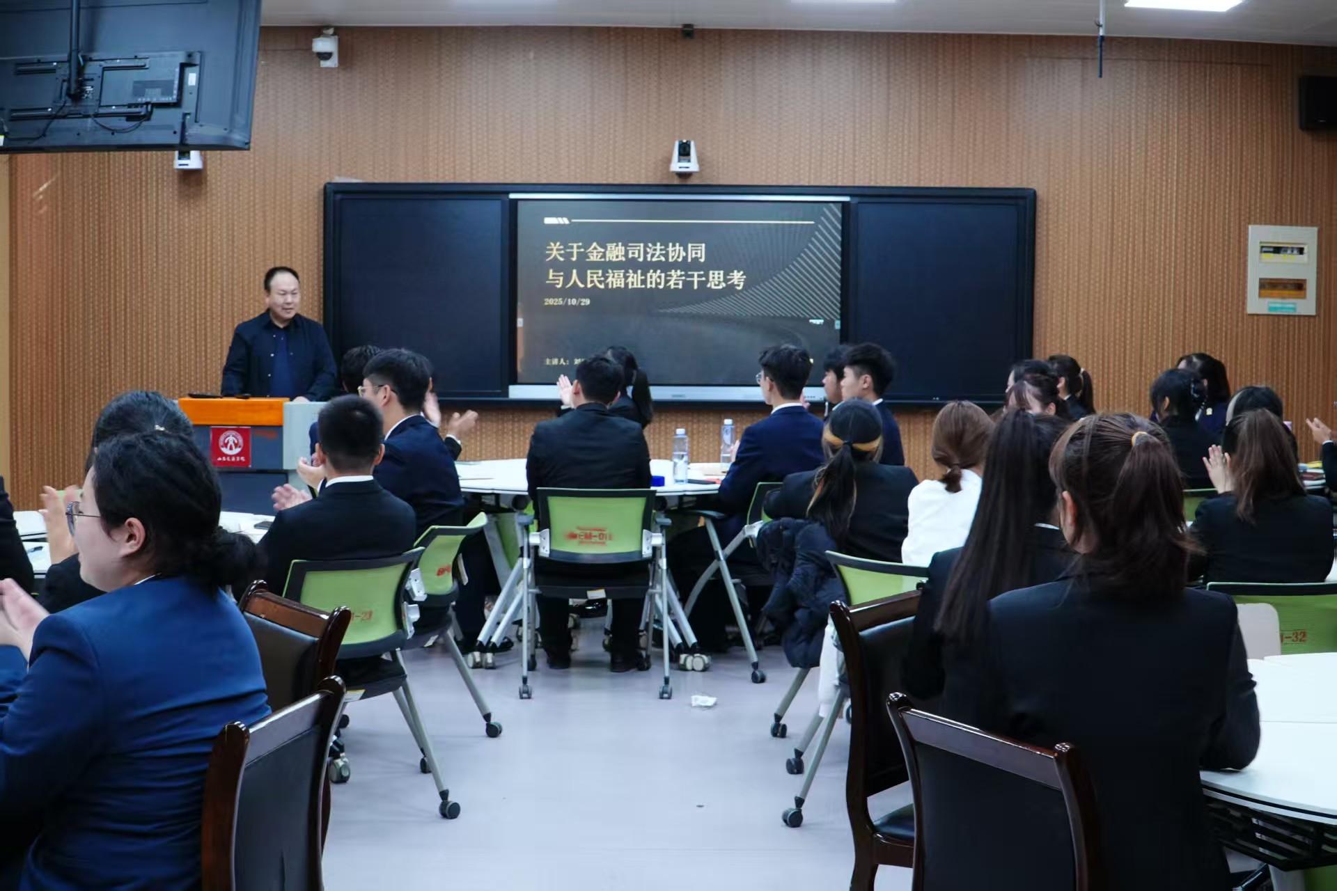 刘瑞以《行业精英大讲堂:金融司法协同与人民福祉的若干思考》为题,从我国金融监管体系的历史演变切入,结合金融政策解读与金融调解领域丰富实践经验,系统分析了“金融司法协同”的运作逻辑,讲解了中国式现代化金融体系对民生福祉的支撑作用,强调了全能型金融模式下司法协同对风险防控、权益保障的必要性,构建了“理论-实践-社会价值”的完整认知框架,并与参会师生围绕“金融消费者如何通过司法协同维权”“金融创新与风险防控的平衡”等方面交流探讨。