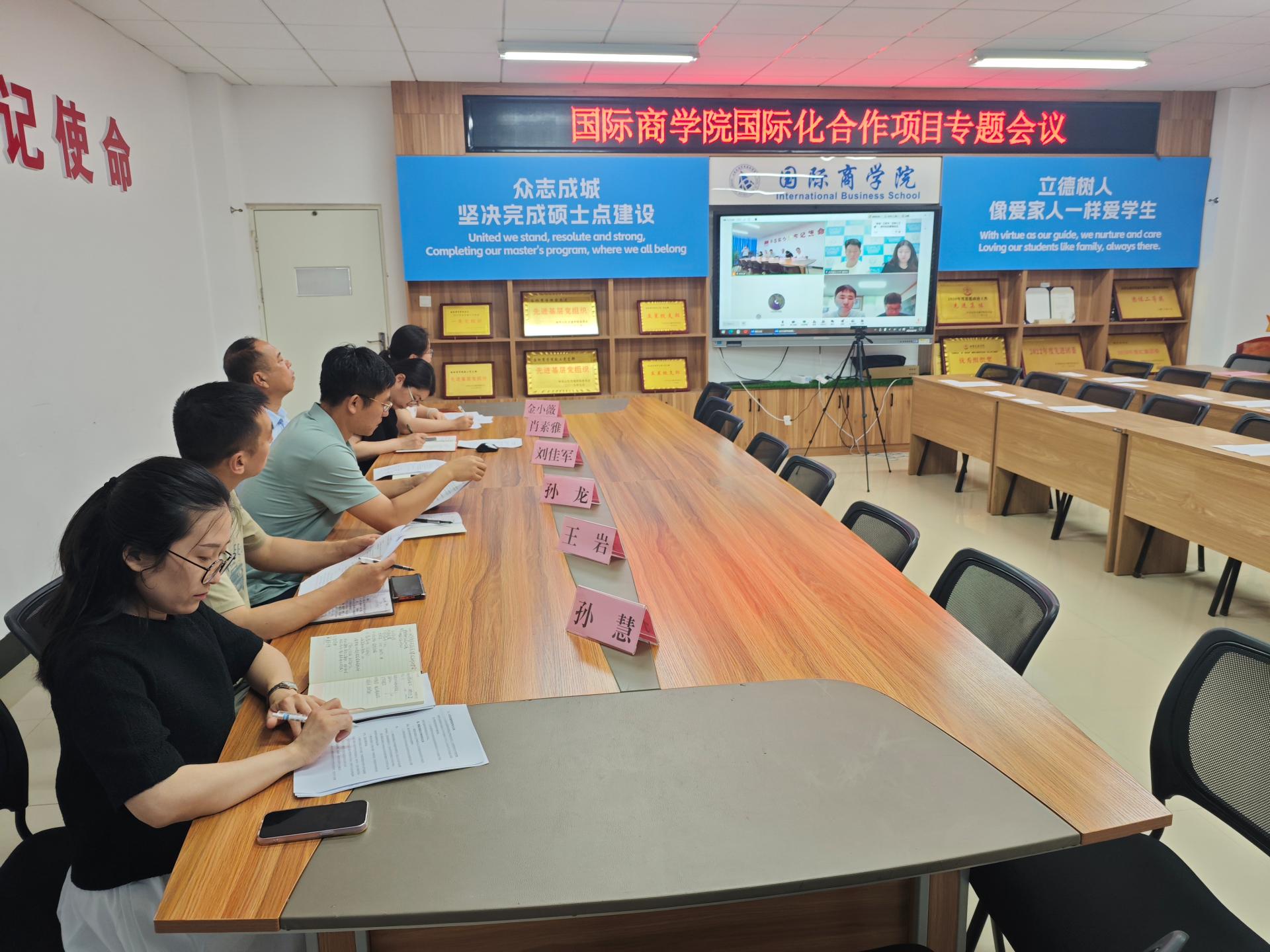 韩国国立庆尚大学经营学院负责人线上参加会议。我校国际合作交流处及国际商学院教师代表参加会议。