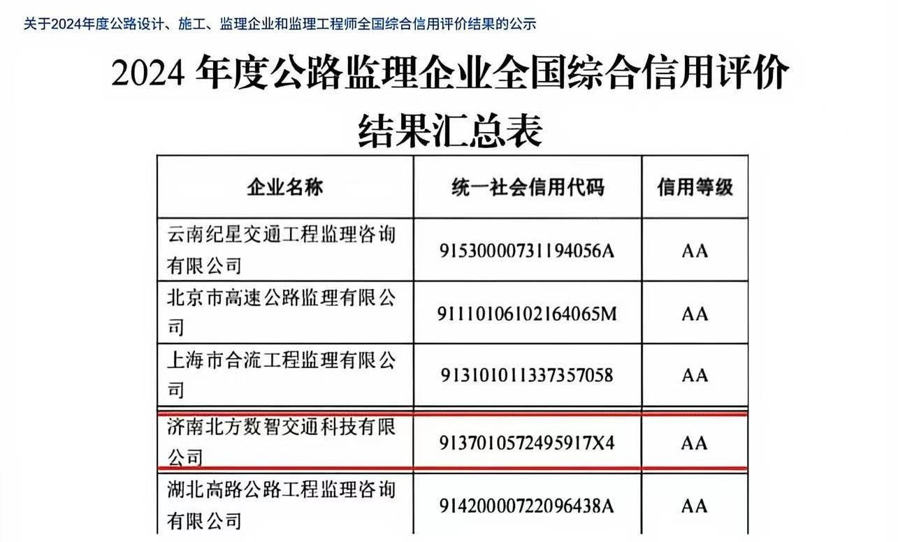 近日,交通运输部公布2024年度公路建设市场全国综合信用评价结果,我校交通基础设施建设工程研究中心(济南北方数智交通)再次荣获公路监理企业全国综合信用评价AA等级,标志着其在行业内的信誉与实力获得国家权威认可。