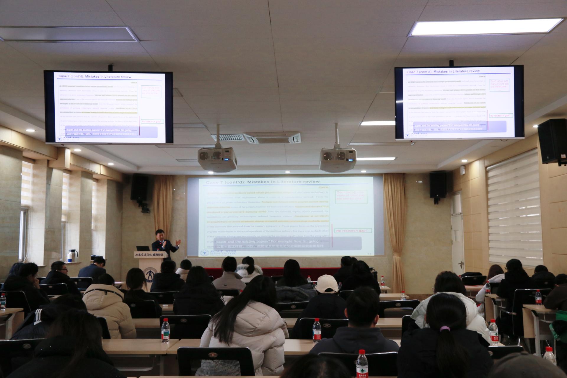 在专题讲座环节,李教授围绕《绿色与数字航运通道的挑战与机遇》主题,系统解读了全球绿色航运通道发展现状与面临的核心挑战,并从多利益相关方角度提出发展机遇。随后,他以《如何在交通运输与物流类期刊发表论文:核心注意事项》为题,结合自身期刊评审经验,剖析了学术研究各环节的常见问题与应对策略,为师生论文撰写与投稿提供了切实指导。
