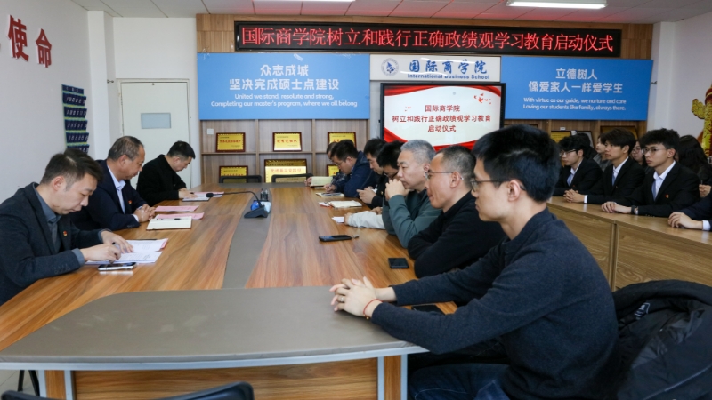 刘佳军就开展本次学习教育提出三点要求:一要筑牢思想根基,深刻把握正确政绩观的核心要义,以坚定的理想信念筑牢政绩观根基,在创建党建标杆院系的进程中凸显党员干部的先锋模范作用。二要坚持实干担当,以务实作风践行正确政绩观,勠力同心,在国际商务硕士点的建设中释放最大能量。三是坚守为民初心,以实绩实效诠释正确政绩观,笃行致远,开拓具有国际化特色的办学新局。