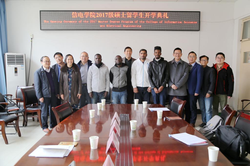 11月16日上午,我校2017级硕士留学生新生开学典礼在综合实验楼231会议室举行。学科与研究生处、国际交流合作处、信息科学与电气工程学院、国际教育学院相关负责同志、硕士导师以及在校硕士留学生参加了开学典礼。