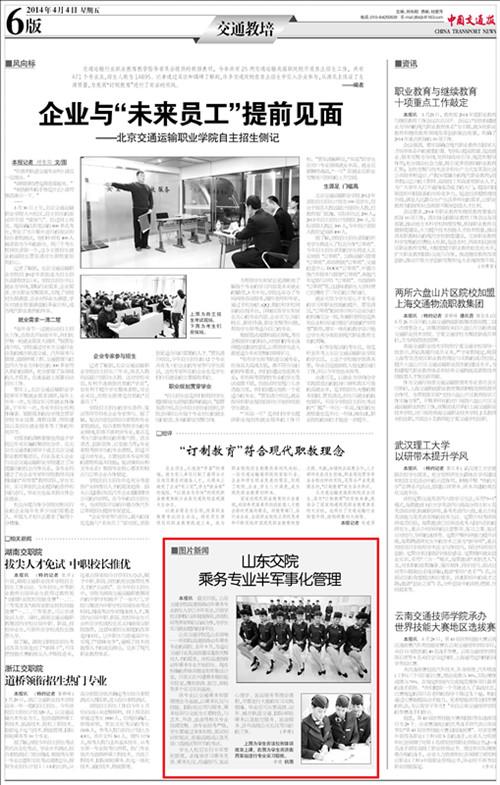 本报讯 截至目前,山东交通学院高速铁路动车乘务专业新生入学已半年有余,目前学校正积极与济南铁路局、济南机场等多家单位洽谈合作,为学生实习就业提供良好平台。