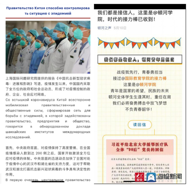 疫情发生以来,顿河学院将疫情防控当作一堂“大思政课”。通过“抗击疫情,我们在行动”“抗击疫情,用俄语发声”等活动鼓励学生用俄语录制视频,并在俄罗斯境内疫情快速蔓延时,顿河学院中外合作办学师生通过录制视频等形式,呼吁两国师生齐心协力、共克时艰,共同战胜疫情。