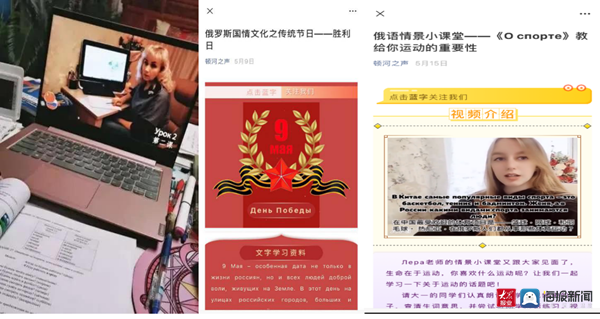 打造“浸入式”线上语言教学模式,补充第一课堂教学不足。在微信公众号“顿河之声”开辟“俄罗斯国情文化”“俄语口语情景小课堂”“顿河学子学习风貌”等特色学习板块,再现俄罗斯商店购物等日常生活情景,让学生们在了解国外知识文化的同时,真切感知中外,理解情境中所传递的信息和语言材料,为实际语言交际架起一道桥梁。