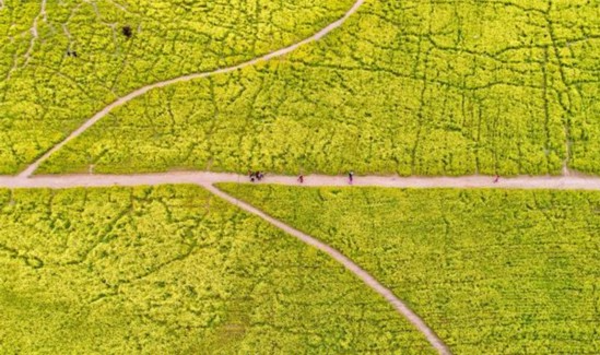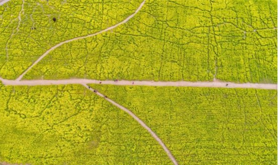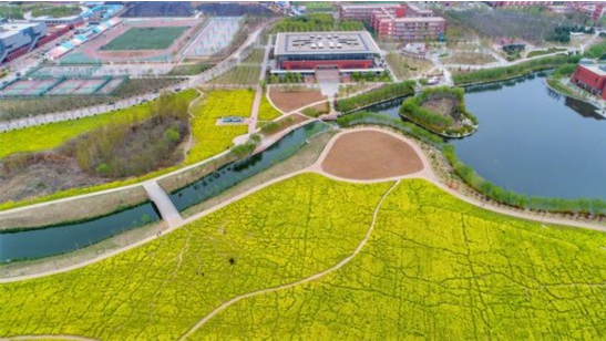 10日,山东交通学院济南长清校区的近百亩油菜花进入盛开期,从百米空中看去,成片的油菜花田金黄灿灿,漫步其中如同画中游,气势堪媲美江西婺源的油菜田。
