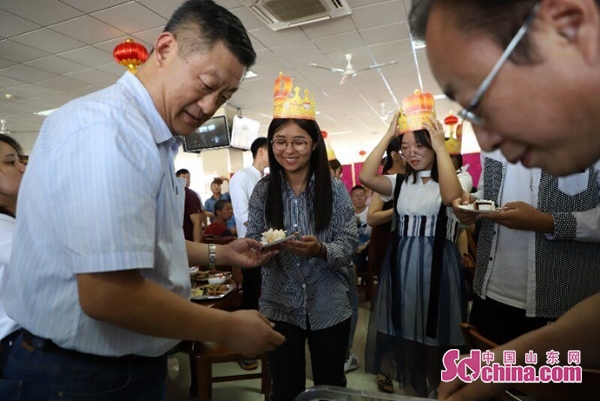 "同学们,祝你们生日快乐。"陈校长的一句话感动了在场的不少学生。原来,包括信息专业王渝,法学院王艺文,外国语学院林语嫣在内的七名新生今天同天生日,报道时学生处的工作人员专门留意了这个信息,特意给他们买了蛋糕,集体为他们过生日。"真的是个惊喜,在家里都没怎么过过生日,上大学了竟然还能过生日。"来自高密的学生王渝告诉记者,自己要打电话告诉爸爸妈妈,向他们述说这一喜悦,接下几年,自己一定会好好学习,回馈学校。