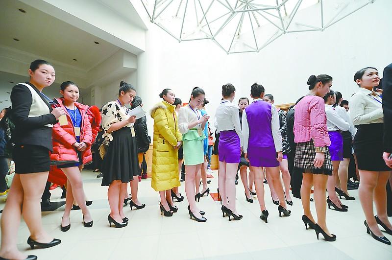 23日,在山东交通学院,众多女考生穿着短裙等待参加测试。 记者王锋 摄