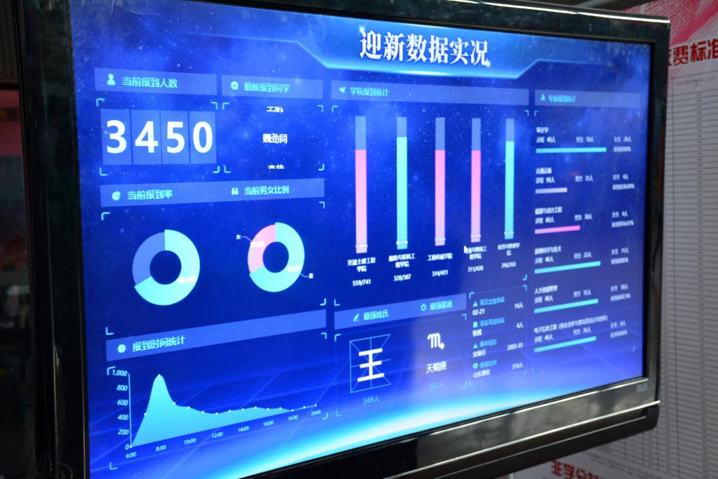 在山东交通学院的迎新现场,摆放了一台引导宣传屏。宣传屏通过当前报到人数、最新报到同学、当前报到率、当前男女比例、报到时间统计、最强姓氏、最强星座及专业报到统计等类别实时更新迎新数据。有趣的是,该系统统计了学校最强星座是天蝎座,共有457人;重名最多的新生名字是王磊,有6人;潍坊则以今年295人考入山东交通学院被称为“最强地域”。