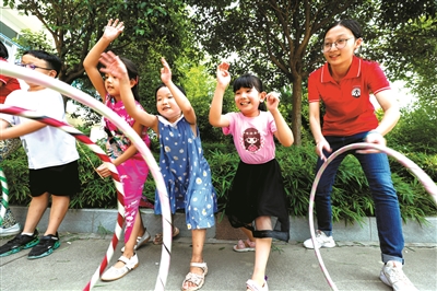 “比比看谁的呼啦圈滚得更远!”在孩子们的欢声笑语中,大学生志愿者精心准备的一节趣味体育课就这样开始了。这样的趣味课程寓教于乐,深受孩子们的喜爱,让他们在玩中学知识、长见识。