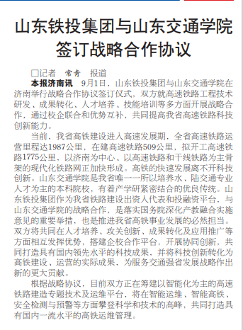 本报济南讯 9月1日,山东铁投集团与山东交通学院在济南举行战略合作协议签订仪式,双方就高速铁路工程技术研发、成果转化、人才培养、技能培训等多方面开展战略合作,通过校企联合和优势互补,共同提高我省高速铁路科技创新能力。