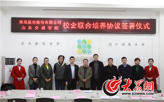 大众网·海报新闻1月9日讯(记者 聂忆宏 通讯员 郭忠利 李媛冉)1月8日,山东交通学院与青岛航空股份有限公司在山东交通学院艺术与设计学院举行了空中乘务专业校企联合培养协议的签署仪式,学校党委副书记唐勇出席活动。