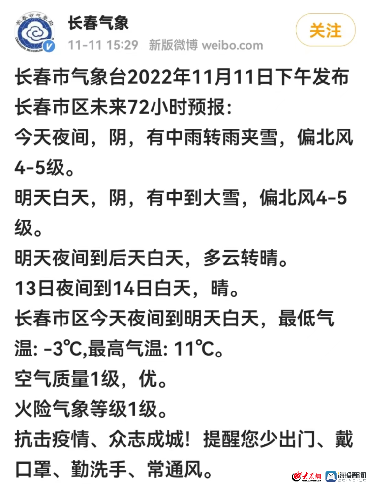 长春市气象台11日的天气预报显示,当晚有中雨转雨夹雪,12日有中到大雪