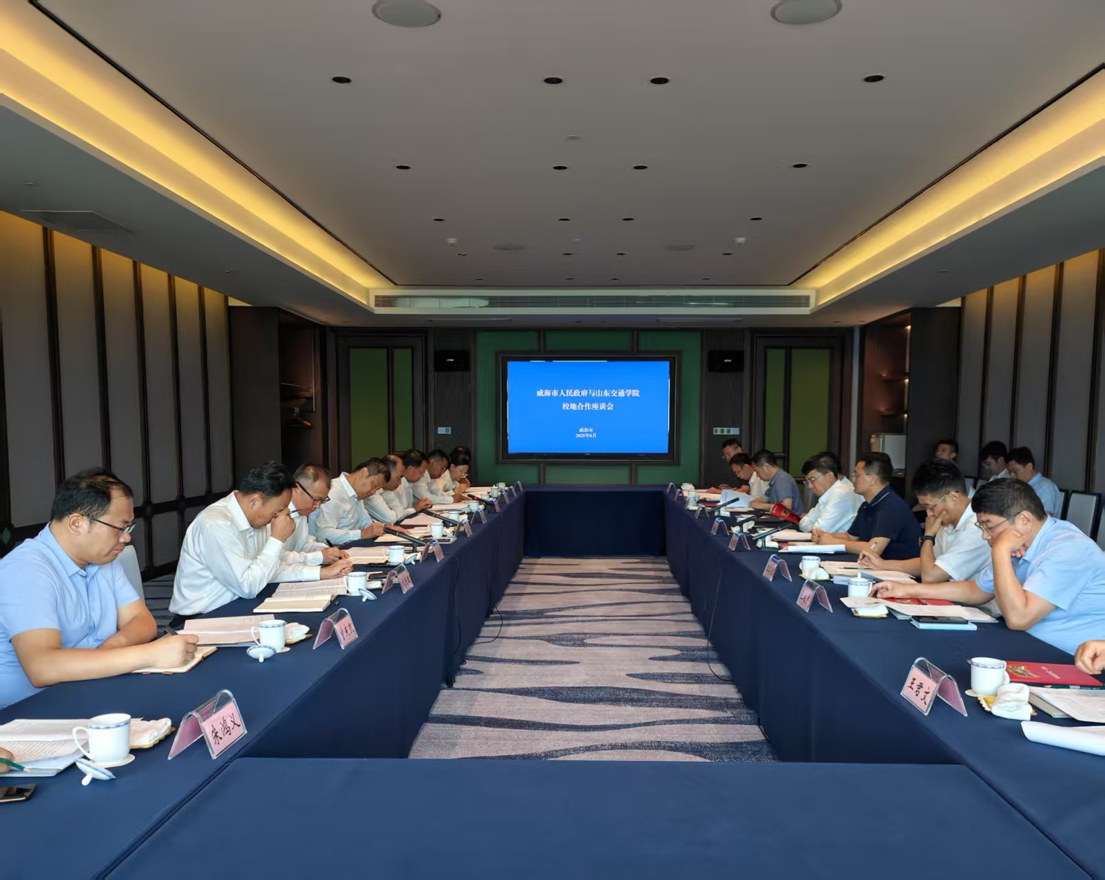 6月20日上午,党委书记王伟,党委副书记、院长孔伟金,党委副书记李贞涛,党委委员、副院长姜华平,党委委员、党委统战部部长刘庆波,与威海市委书记闫剑波,市政府党组成员、副市长刘奎忠座谈交流。