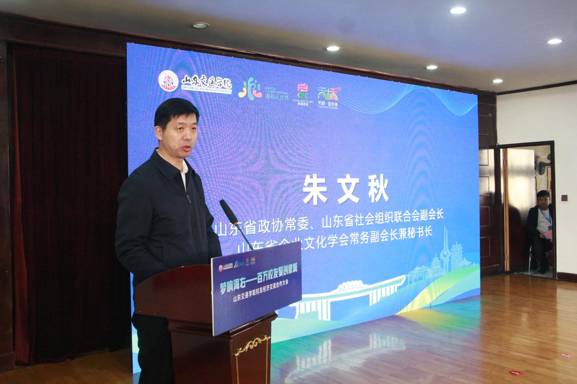 朱文秋在致辞中回顾了山东省企业文化学会与山东交通学院的合作历程,对学校在人才培养、科技创新、服务地方、凝聚校友等方面取得的成果给予高度认可。他表示,作为山东交通学院的亲密伙伴,学会将继续发挥平台优势,携手学校与校友企业,在校友经济、科教融合等领域开拓更广阔的合作空间,为交通强国山东示范区建设贡献力量。