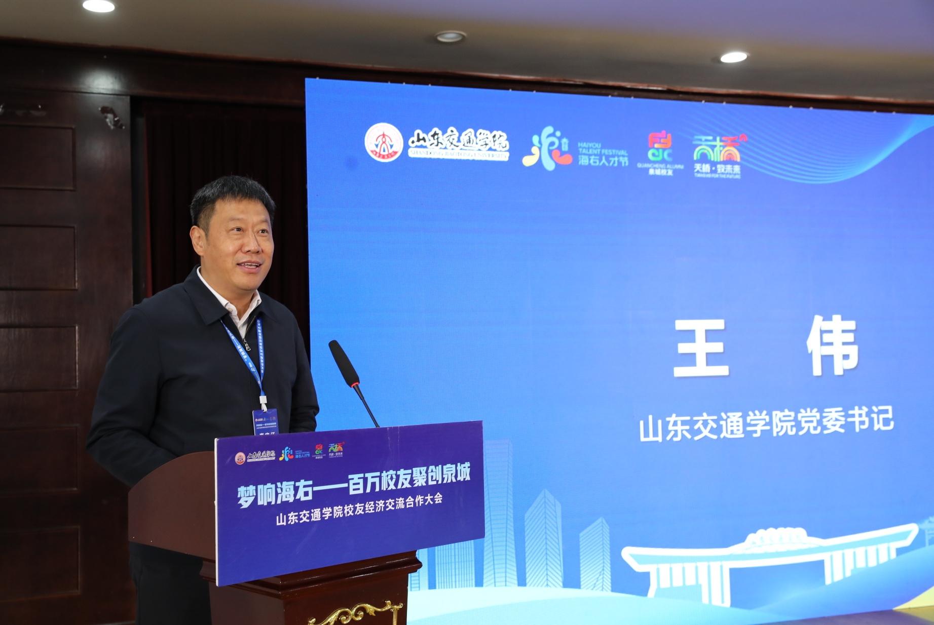 为庆祝建校69周年,深化校地合作,10月18日,由济南市委人才办指导,学校与天桥区委区政府共同举办的“梦响海右——百万校友聚创泉城”山东交通学院校友经济交流合作大会在无影山校区培训中心召开。天桥区委书记孙战宇,山东省政协常委、山东省社会组织联合会副会长、山东省企业文化学会常务副会长兼秘书长朱文秋,天桥区委常委、组织部部长李盛利,山东公路学会理事长毕京建,山东省人民政府外事办公室欧洲处副处长陈雅婷,济南市委组织部人才工作二处处长吴俊,济南市教育局高校联络服务处处长吕正平,学校党委书记王伟,党委副书记李贞涛,党委委员、副院长王保群,党委委员、副院长徐静,党委委员、副院长张萌萌,党委委员、党委统战部部长刘庆波出席。会议由王保群主持。
