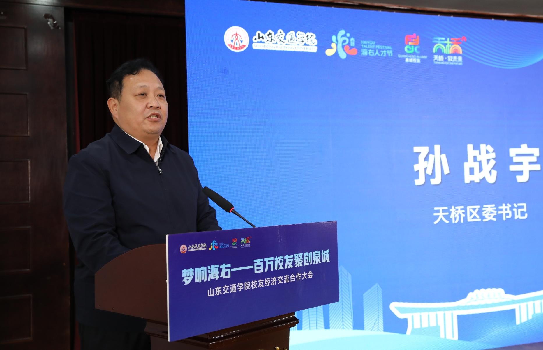 孙战宇对大会召开表示祝贺,详细介绍了天桥区作为济南唯一地跨黄河两岸中心城区的战略优势、产业布局与营商环境。他指出,天桥区与山东交通学院情谊深厚,天桥不仅是各位校友魂牵梦萦的“青春故土”,更是一片充满机遇的“创业热土”。他强调,随着黄河重大国家战略的深入实施,天桥区已成为济南新旧动能转换起步区建设的桥头堡、服务融入黄河重大国家战略的主阵地,期待更多校友走进天桥、了解天桥、投资天桥,在城市更新、智慧交通等领域深化合作,共同书写校地企共赢新篇章。