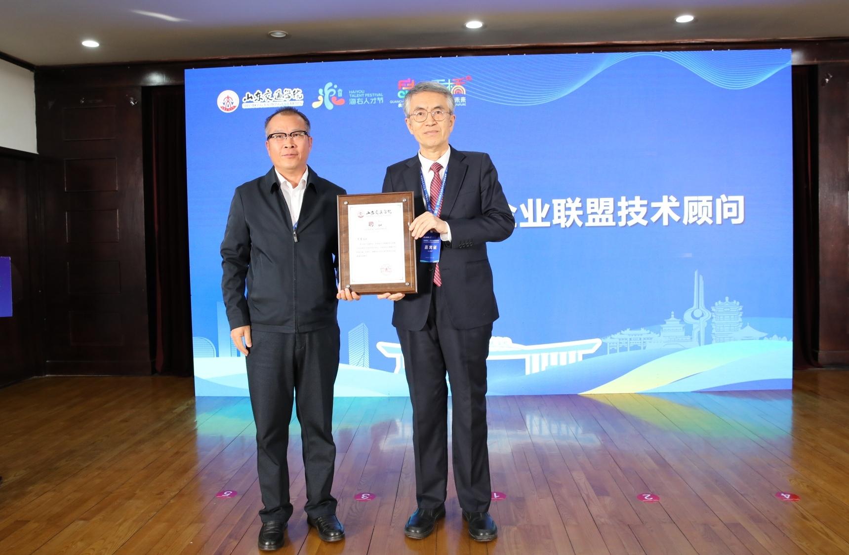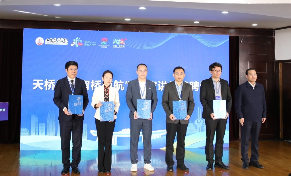 李贞涛为国家级人才、学校教授于雷颁发“山东交通学院校友企业联盟技术顾问”聘书;李盛利颁发天桥区“智桥领航”专家讲堂特聘讲师证书。