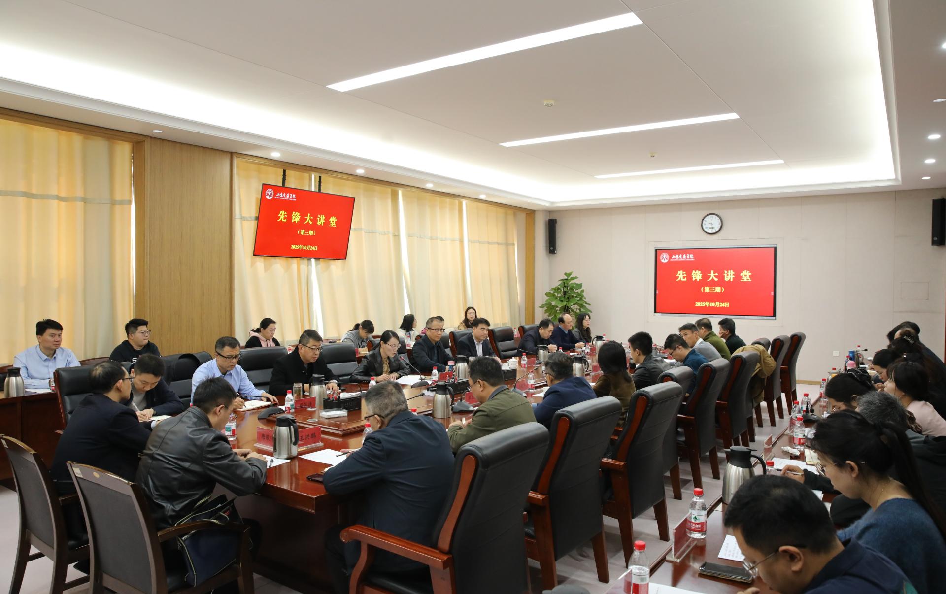10月24日上午,学校在长清校区明德楼303会议室举办2025年第三期“先锋大讲堂”。山东航空学院飞行学院党委书记任传永受邀作专题辅导报告。学校党委副书记李贞涛,党委委员、党委组织部部长王兴盈出席。会议由王兴盈主持。