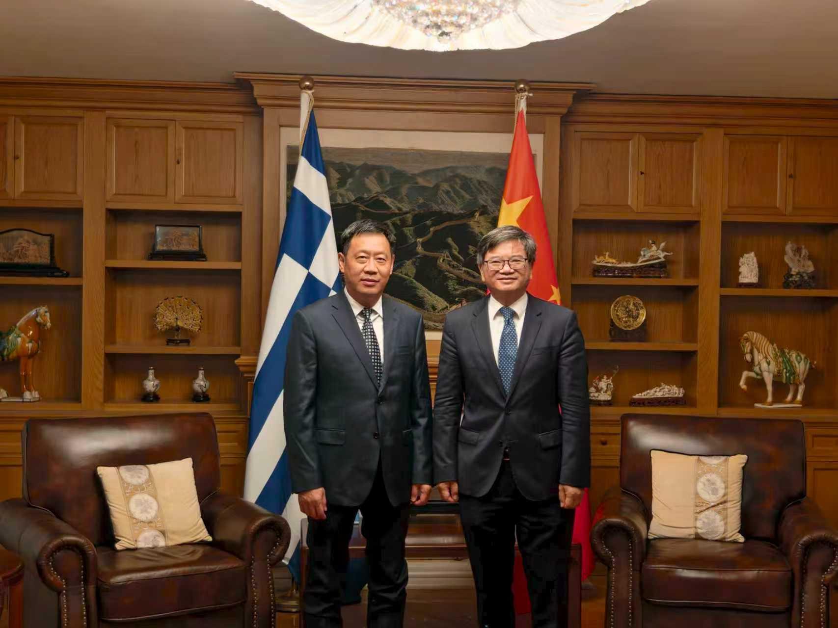 在希腊期间,代表团访问了中国驻希腊大使馆,与公使衔参赞赖波、教育一秘王迎、交通部驻使馆专员张同戌进行座谈,详细了解希腊有关产业结构、中资企业在希投资建设、中希文化交流以及高校合作情况。双方一致认为,要充分发挥希腊在远洋运输、船舶制造、港口物流等方面的优势,深化中国(山东)-中东欧国家科教产融汇发展中心建设,广泛汇聚中希教育、科技、产业资源,努力实现互利共赢、持续发展。