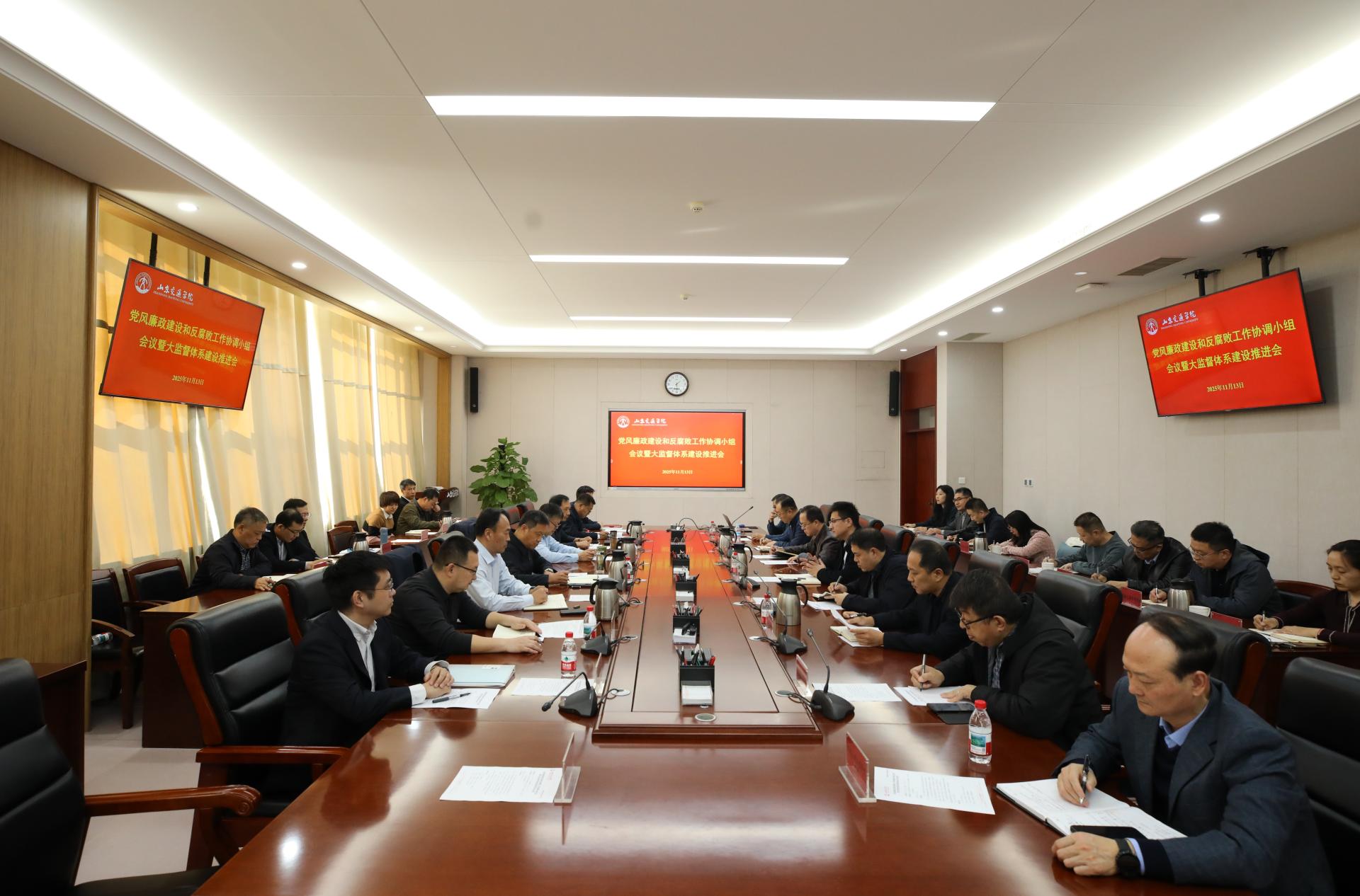 11月13日下午,学校在长清校区明德楼303会议室召开党风廉政建设和反腐败工作协调小组会暨大监督体系建设推进会。学校党委书记王伟,党委委员、纪委书记、监察专员刘世杰,党委委员、党委统战部部长刘庆波出席。会议由刘世杰主持。