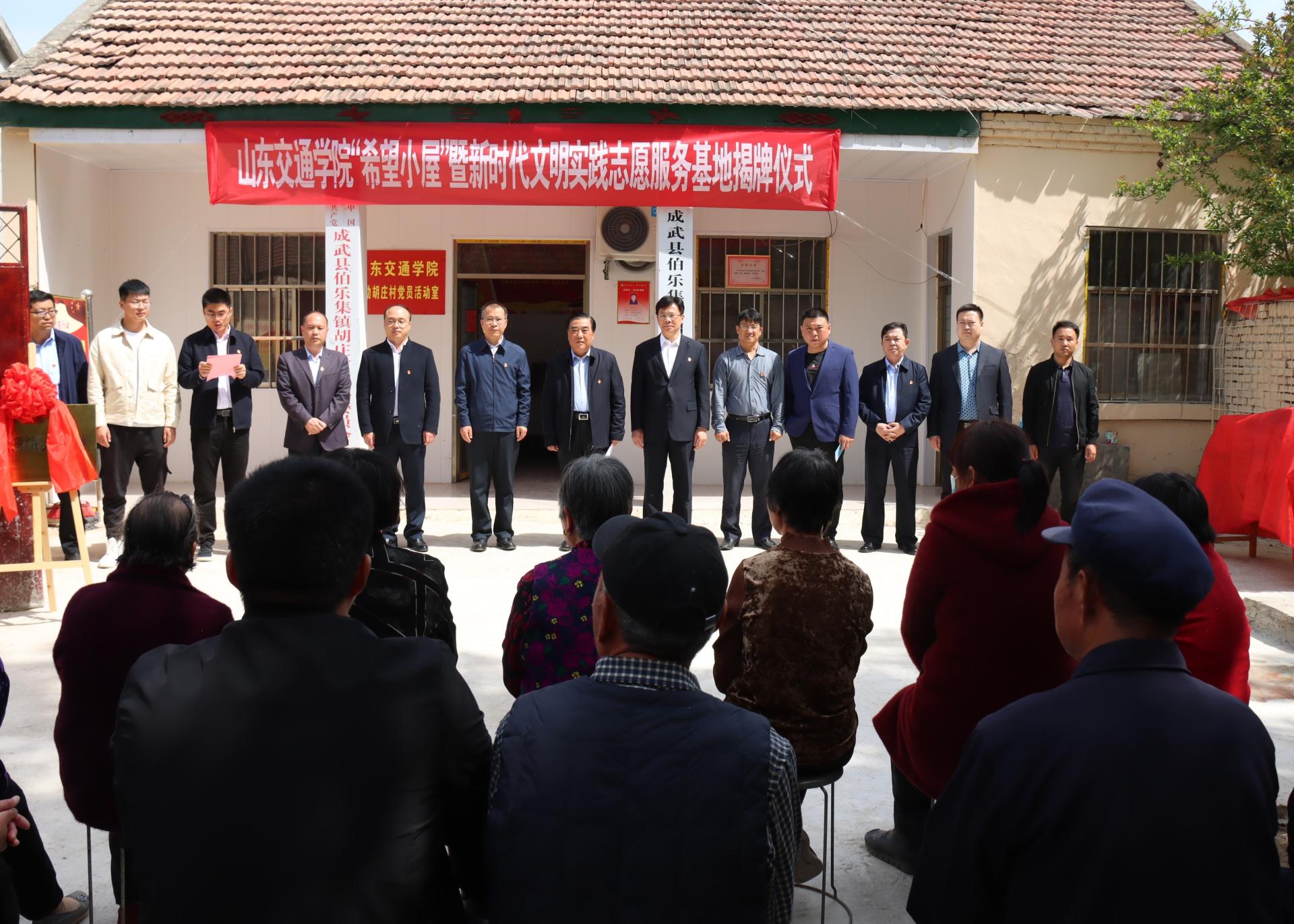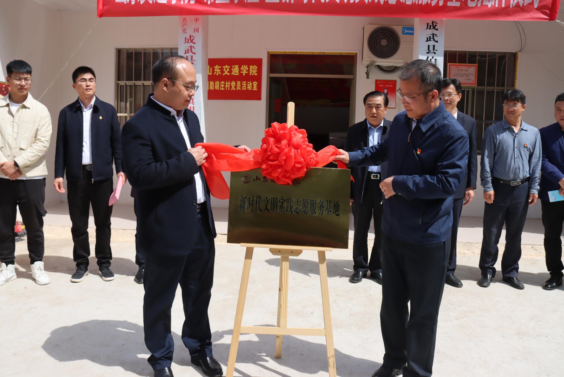 在我校第一书记帮扶的胡庄村党员活动室,李贞涛和张景锋为“山东交通学院新时代文明实践志愿服务基地”揭牌,我校“第一书记”和四家爱心企业负责人分别进行了“希望小屋”揭牌及助学物资捐赠。