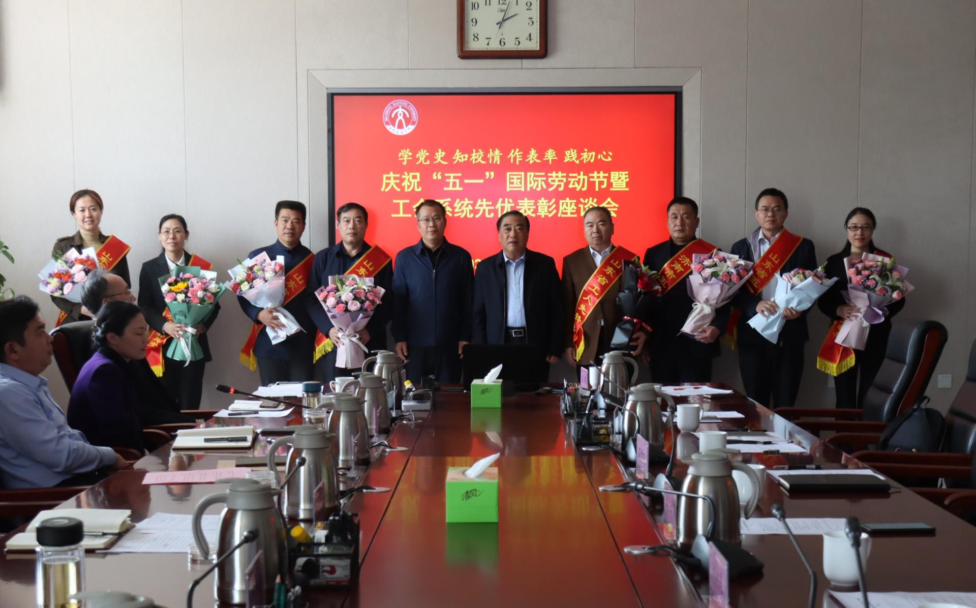 4月29日下午,学校“学党史、知校情、作表率、践初心”——庆祝“五一”国际劳动节暨工会系统先优表彰座谈会在长清校区明德楼303会议室召开。党委书记王焕斌,党委副书记李贞涛,党委委员、党委组织部部长田杰昌,党委委员、党委办公室(学校办公室)主任王晨晖,党委委员、党委宣传部部长周颜玲出席座谈会。座谈会由李贞涛主持。