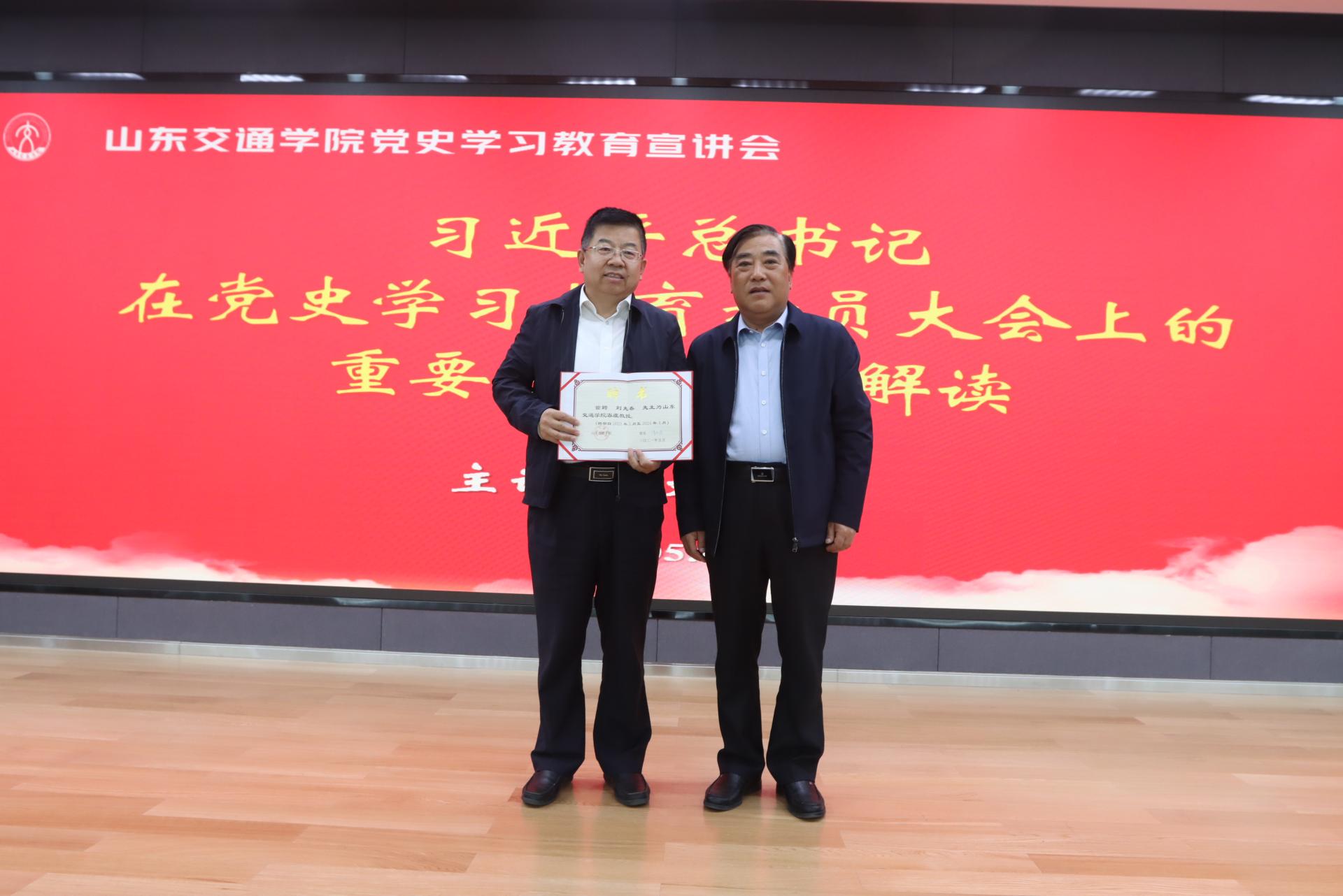 王焕斌对刘先春的到来表示热烈欢迎,并为刘先春颁发山东交通学院“客座教授”聘书。