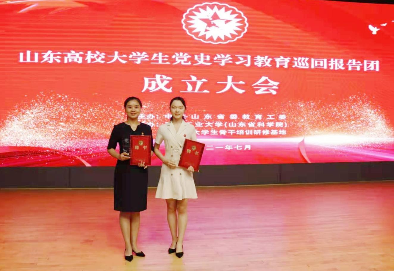 会议宣布了山东高校大学生党史学习教育巡回报告团成员名单,举行了授旗仪式,颁发了聘书,并举办了首场报告会。我校交通与物流工程学院辅导员杨丽娜和艺术与设计学院空中乘务专业2020级学生任文雨分别入选教师报告团和学生报告团。