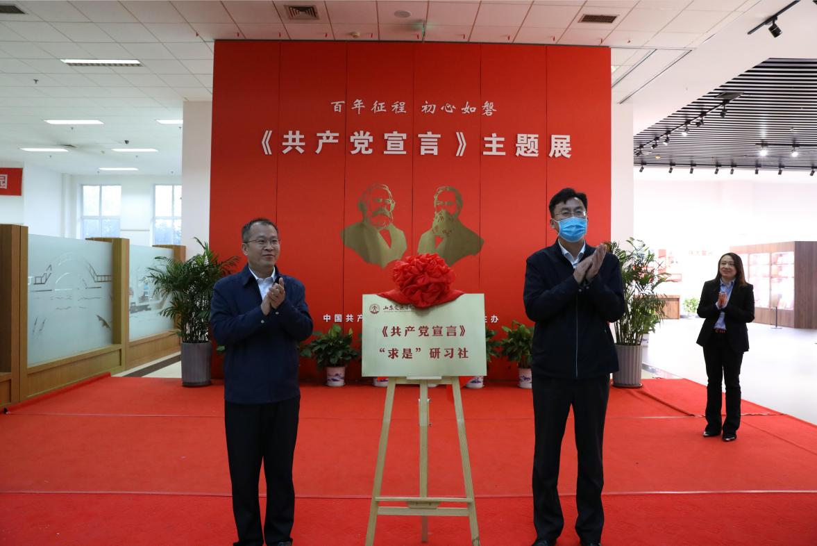 10月11日下午,学校在长清校区图书馆举行《共产党宣言》“求是”研习社揭牌仪式。共青团山东省委副书记尚胜波、学校党委副书记李贞涛出席活动。