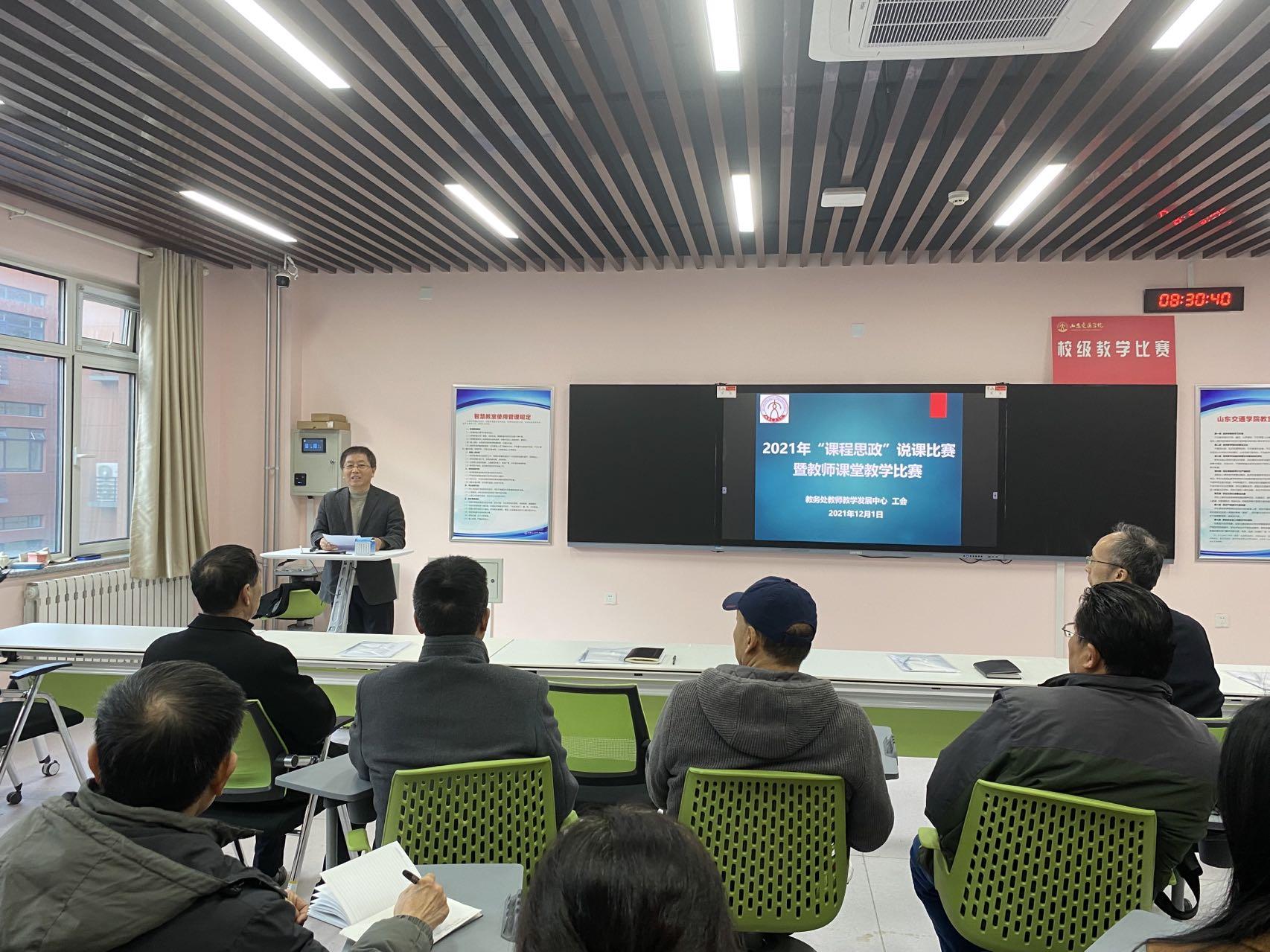 为加强课程思政建设水平、提高教师教学能力,近日,学校在长清校区机电楼B座智慧教室举办了2021年“课程思政”说课比赛暨教师课堂教学比赛。党委委员、副院长张化祥出席活动。