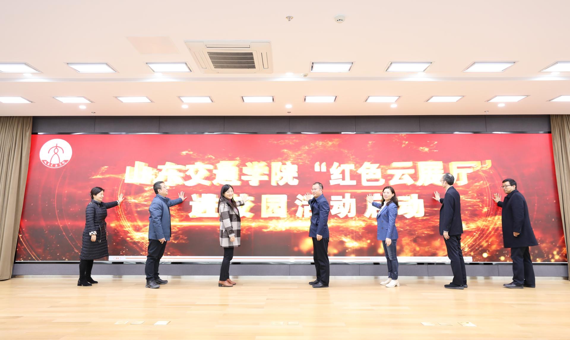 李贞涛、相关职能部门负责人共同上台启动活动。学生工作处处长于翊广宣读了《山东交通学院“红色云展厅”进校园活动方案》。