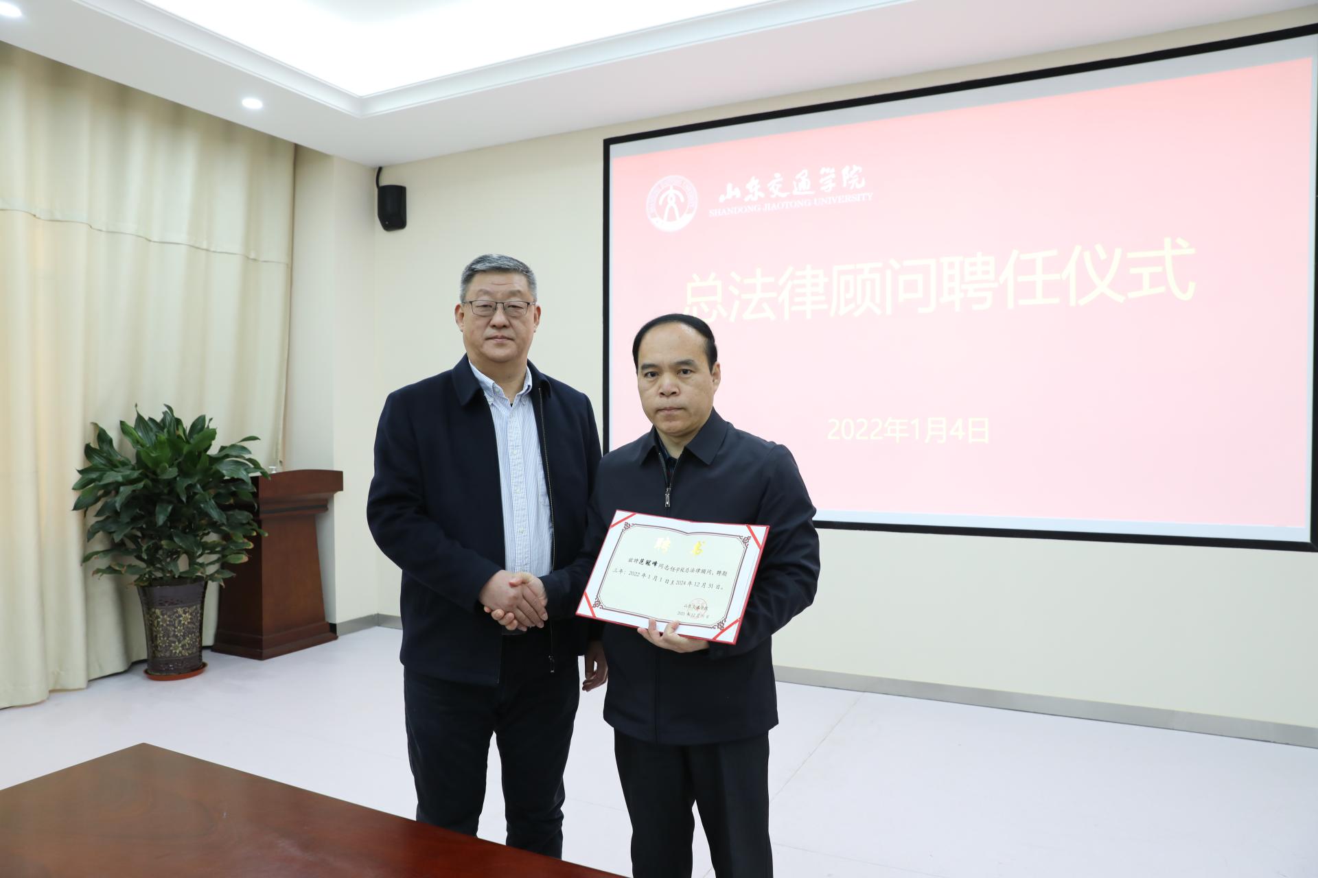 根据山东省教育厅文件精神,学校实施总法律顾问制度,决定聘任交通法学院院长范冠峰为学校总法律顾问。陈松岩作为学校法定代表人与范冠峰签署聘任合同并颁发聘书。