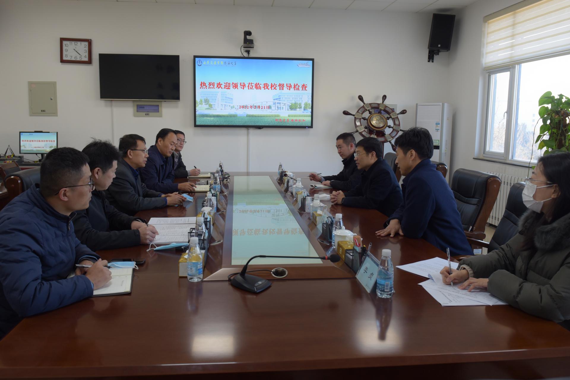2月21日,威海市政府副秘书长殷炳金一行4人走访调研我校威海校区,督导检查春季学期开学疫情防控工作,市教育局总督学王存宝陪同调研。学校党委委员、副院长姜华平出席并主持座谈会。