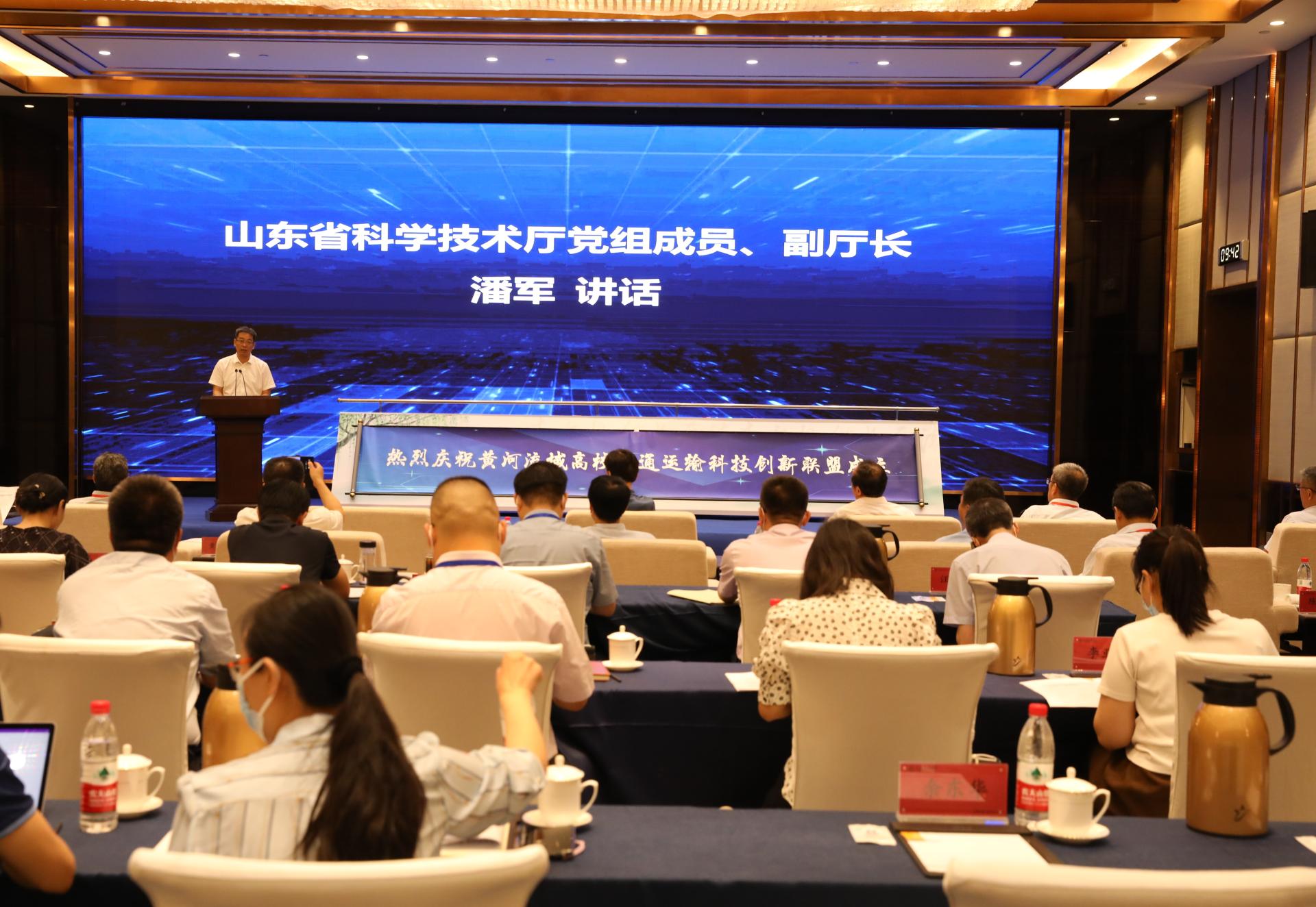 省教育厅副厅长孙晓筠,省科学技术厅党组成员、副厅长潘军,省交通运输厅党组成员、副厅长司家军出席会议并致辞;长安大学党委副书记、校长沙爱民,兰州交通大学副校长陈兴冲,内蒙古大学党委委员、交通学院党委书记孙智凭,太原科技大学交通与物流学院院长晋民杰;山东省海洋科学研究院党组成员、副院长黄祖亮;山东交通学院党委书记王焕斌,党委副书记、院长陈松岩,党委委员、副院长来逢波,党委委员、党委办公室(学校办公室)主任、党委统战部部长王晨晖;以及济南市教育局、科技局,长清区政府、交通运输局,济南新旧动能转换起步区相关领导出席成立大会。会议由王焕斌主持。