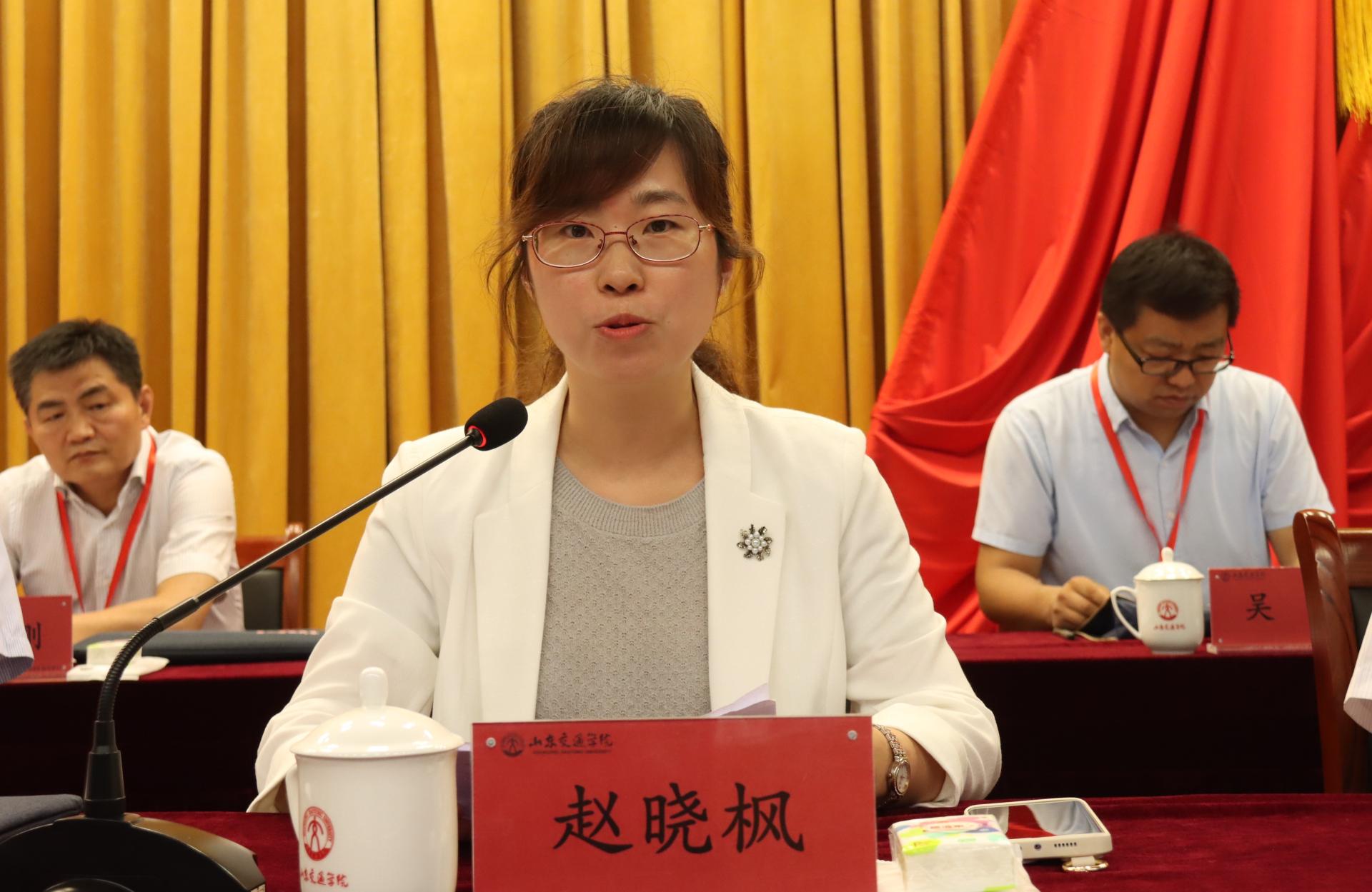 赵晓枫代表中国教育工会山东省委员会向学校这次“双代会”的召开表示热烈祝贺,她指出,山东交通学院建校60多年来,秉承“明德至善 格物致知”的校训和“严 尊 勤 全”的校风,艰苦奋斗、自强不息,致力于服务国家战略和地方经济社会发展,为国家社会培养输送了大批优秀人才,为区域经济社会发展作出了重要贡献。她表示,省教育工会将一如既往地关心和支持山东交通学院的各项工作,积极协调解决问题,努力为工会发挥作用创造便利条件、营造良好氛围、提供更有力的支持和帮助。