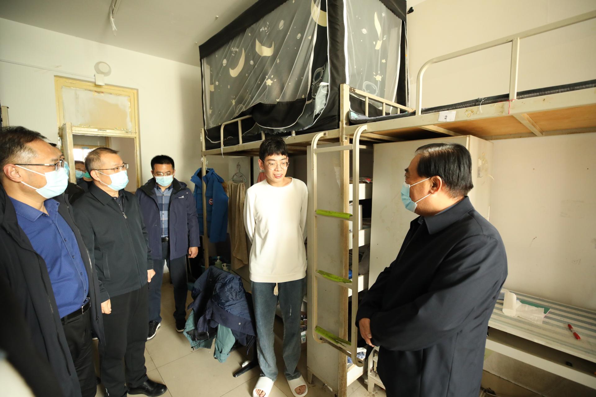 11月26日上午,学校党委书记王焕斌、党委副书记李贞涛带队检查校园疫情防控工作,深入学生宿舍与学生进行交流。