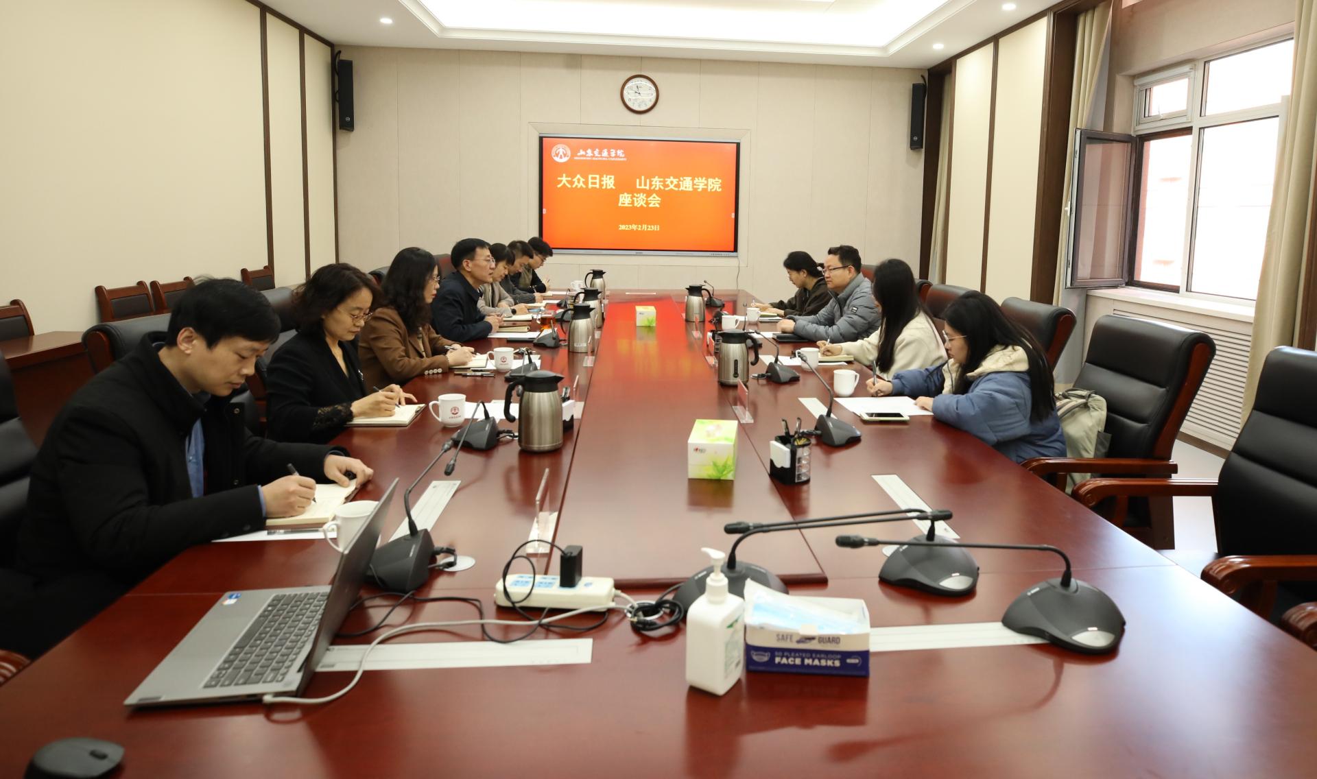 2月23日,大众日报交通记者站站长吴荣欣一行4人来访我校。座谈会在长清校区明德楼302会议室举行。学校党委委员、副院长来逢波,党委委员、党委宣传部部长周颜玲出席座谈会。